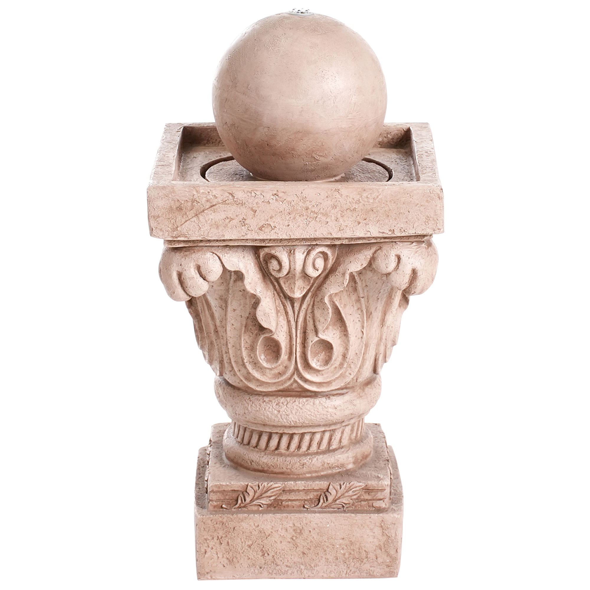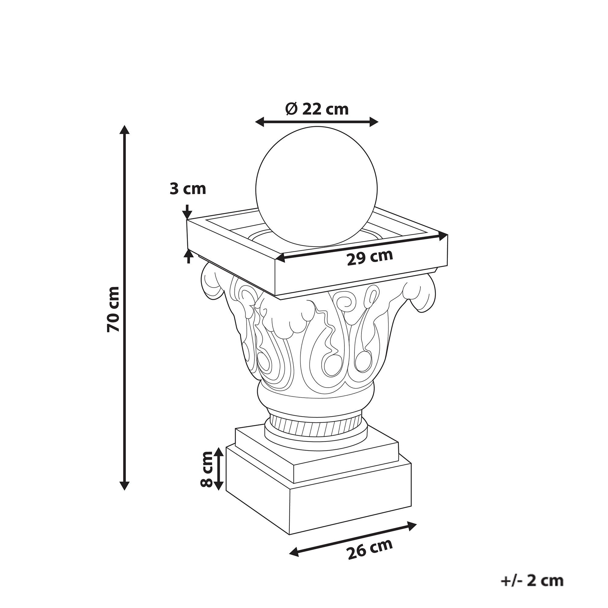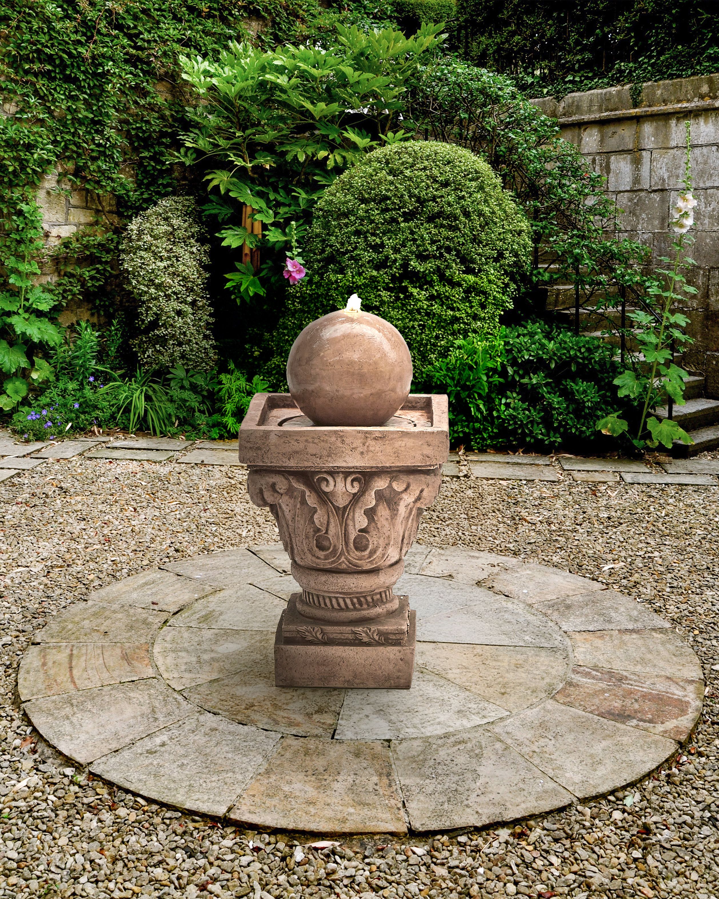 Puutarhan vesielementti LED-valolla. Lisää ulkotilaasi klassista tunnelmaa tällä elegantilla vesiaiheella. Perinteiseen tyyliin suunnitellussa vesielementissä on hienostuneita kaiverruksia ja siroja linjoja, jotka heijastavat ajatonta arkkitehtuuria. Pehmeää ja lämmintä valoa antava sisäänrakennettu LED-valo korostaa veden lempeää virtausta, luoden rauhallisen ilmapiirin. Vesiaihe on sekä kevyt että kestävä, sillä se on valmistettu säänkestävästä hartsista, jonka hillitty sävy tuo viehätystä ja rauhaa mihin tahansa puutarhaan tai terassille.