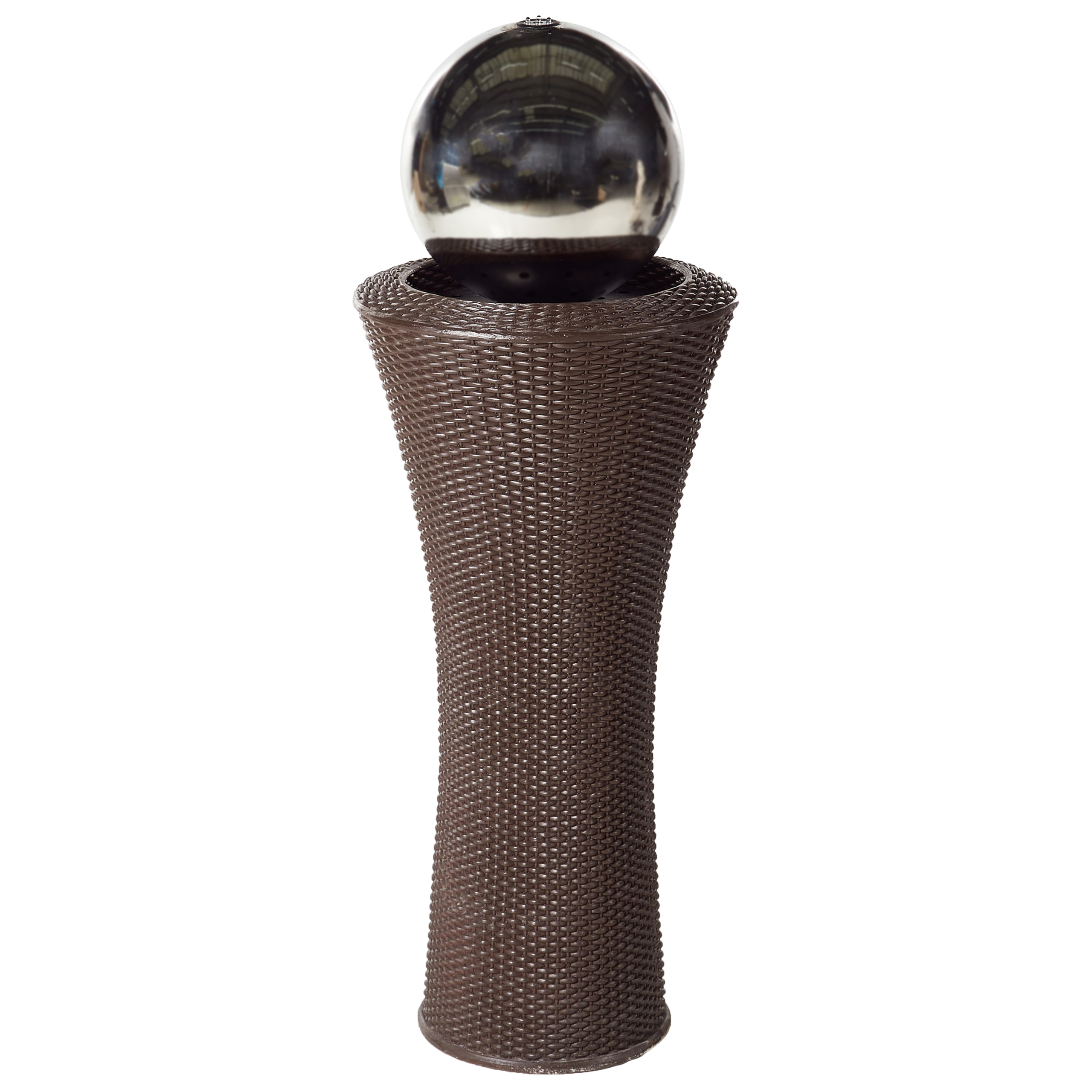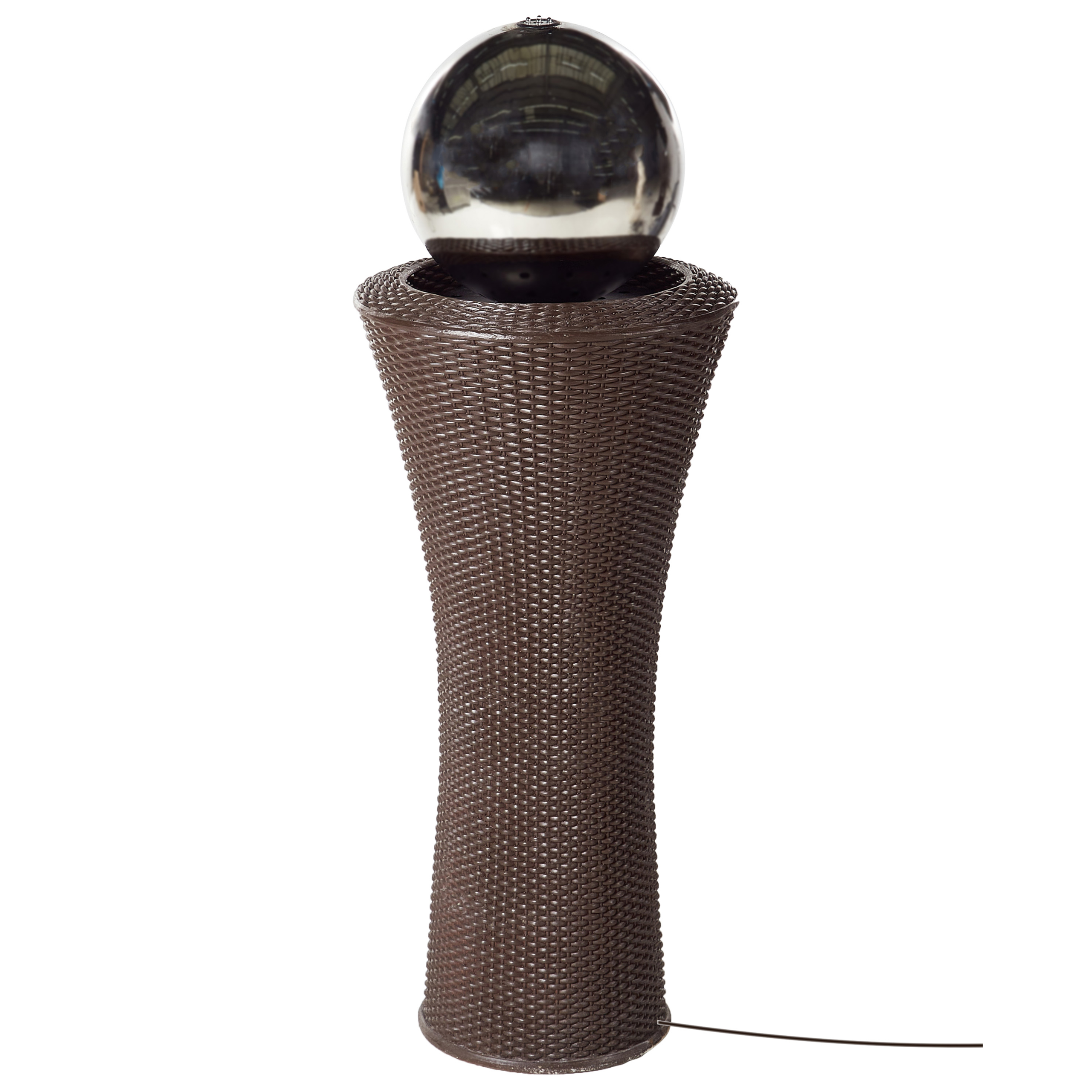 Moderni suihkulähde LED-valolla. Kohota ulkotilaasi tällä näyttävällä modernilla suihkulähteellä, jossa yhdistyvät tyylikäs muotoilu ja rauhoittava veden virtaus. Elegantti, punotulla kuviolla varustettu jalka tukee peilattua palloa, josta vesi pulppuaa lempeästi, luoden lumoavan visuaalisen efektin. Korkealaatuisista ja säänkestävistä materiaaleista valmistettu vesiaihe on sekä elegantti että kestävä. Se tarjoaa täydellisen sekoituksen nykyaikaista estetiikkaa ja tyyneyttä, toimien upeana keskipisteenä missä tahansa puutarhassa tai terassilla.