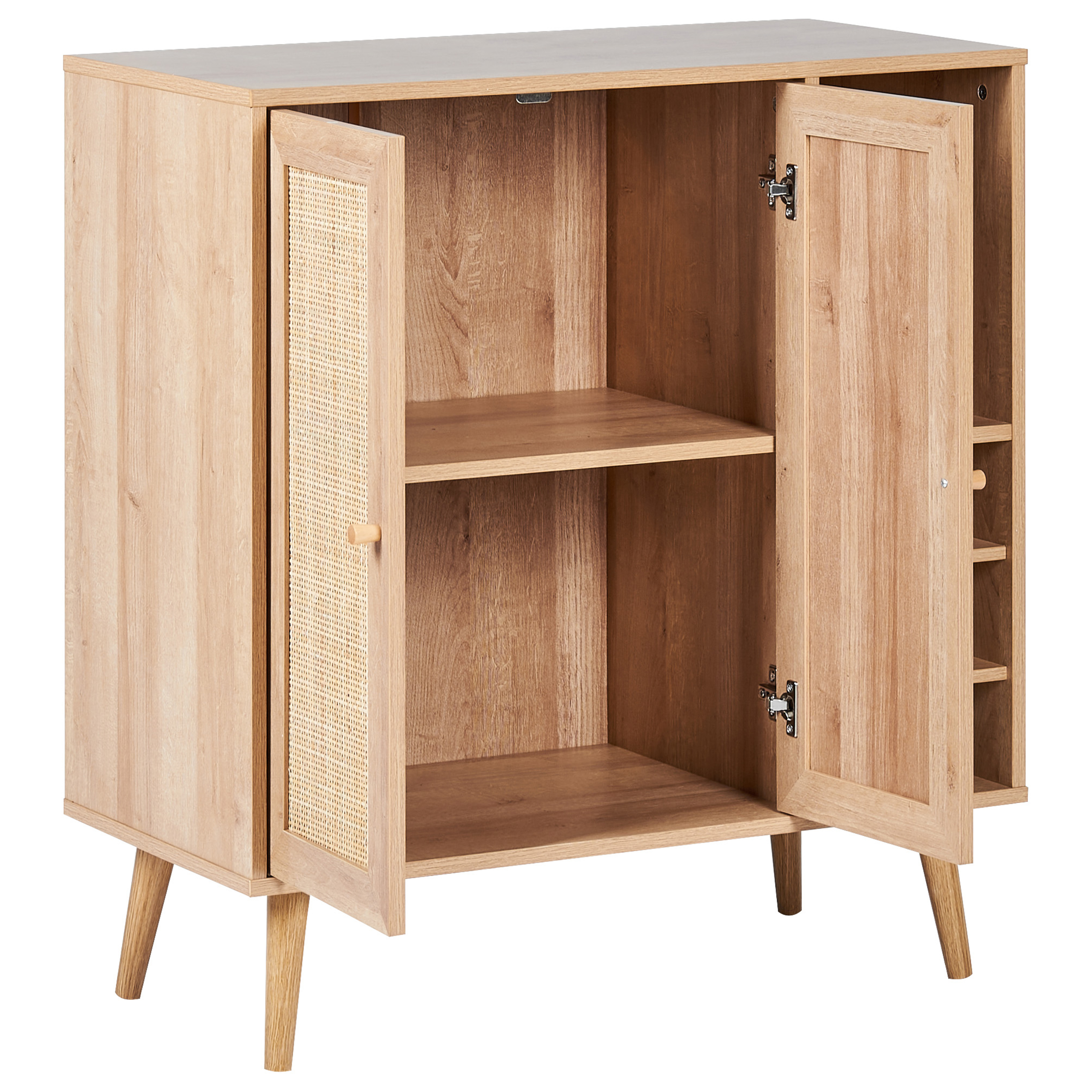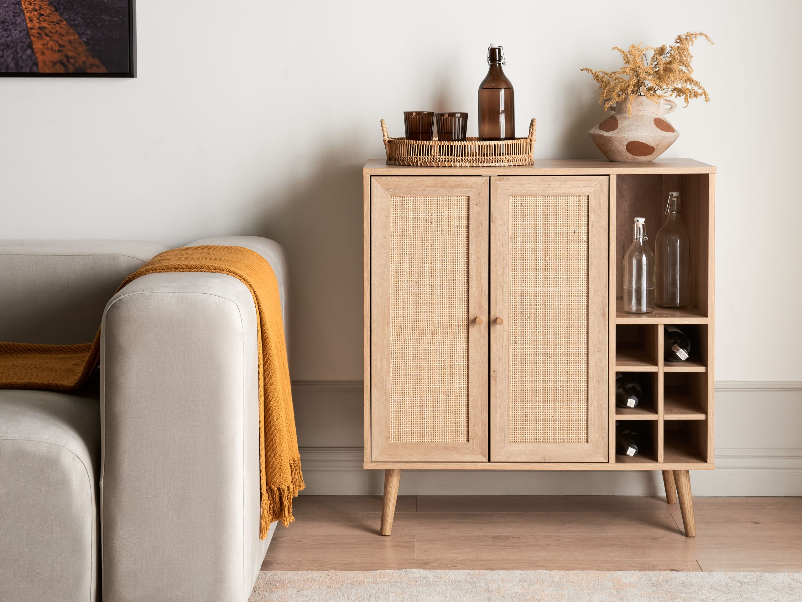 Boheemi kaappi rottinkiverkolla ja viinitelineellä. Tämä tyylikäs viinikaappi yhdistää toiminnallisuuden ja tyylin. Lastulevystä valmistettua runkoa ja tukevia mäntyjalkoja täydentävät hurmaavat rottinkiverkolla viimeistellyt ovet. Ovien taakse kätkeytyvä säilytystila tarjoaa runsaasti tilaa erilaisille esineille, ja sivussa sijaitseva hylly sekä leveä pöytätaso mahdollistavat koristeiden esittelyn. Lisäksi kaapissa on viinipulloteline, johon mahtuu enintään kuusi pulloa. Luonnonpuuta imitoiva viimeistely ja boho-tyylin inspiroima muotoilu tuovat lämpöä ja luonnetta jokaiseen huoneeseen.