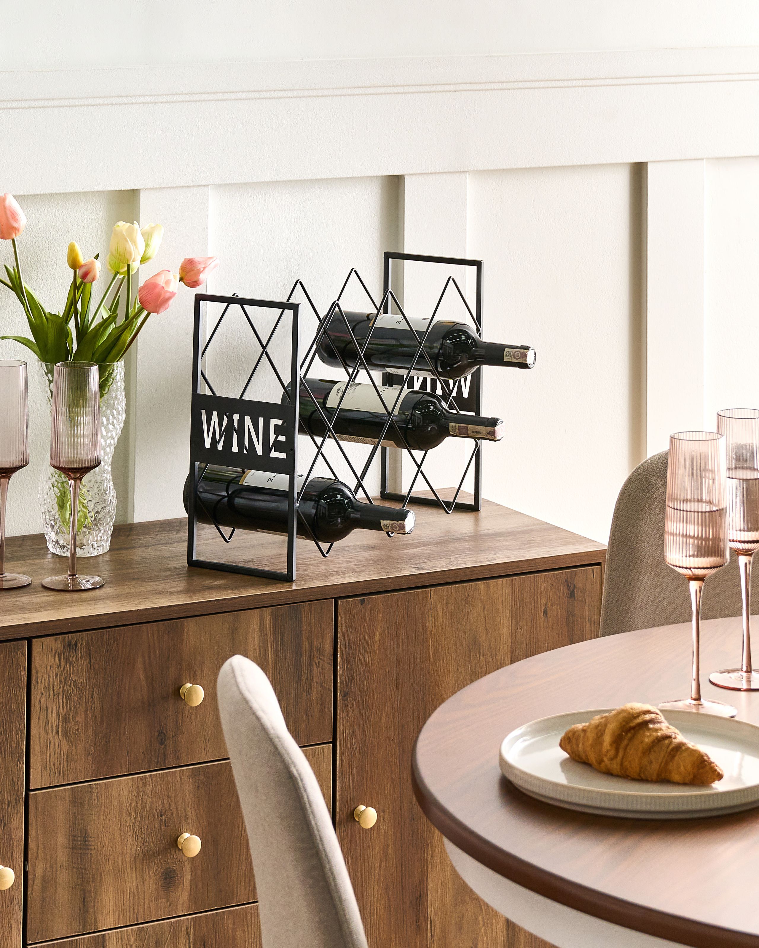 Geometrinen viiniteline kahdeksalle pullolle. Tämä tyylikäs viinipulloteline tarjoaa elegantin ja käytännöllisen tavan pitää viinipullot säilössä. Sileä, hieman kiiltävä pinnoite antaa telineelle modernin ulkonäön, minkä ansiosta se sopii täydellisesti moderneihin, perinteisiin ja industriaalisiin sisustuksiin. Tukeva rakenne pitää useamman pullon siististi vaakasuunnassa, auttaen viiniä säilyttämään makunsa ja laatunsa. Se on erinomainen lisä jokaiseen keittiöön, olohuoneeseen tai ruokailutilaan – täydellinen tiloihin, joissa yksityiskohdilla on väliä.