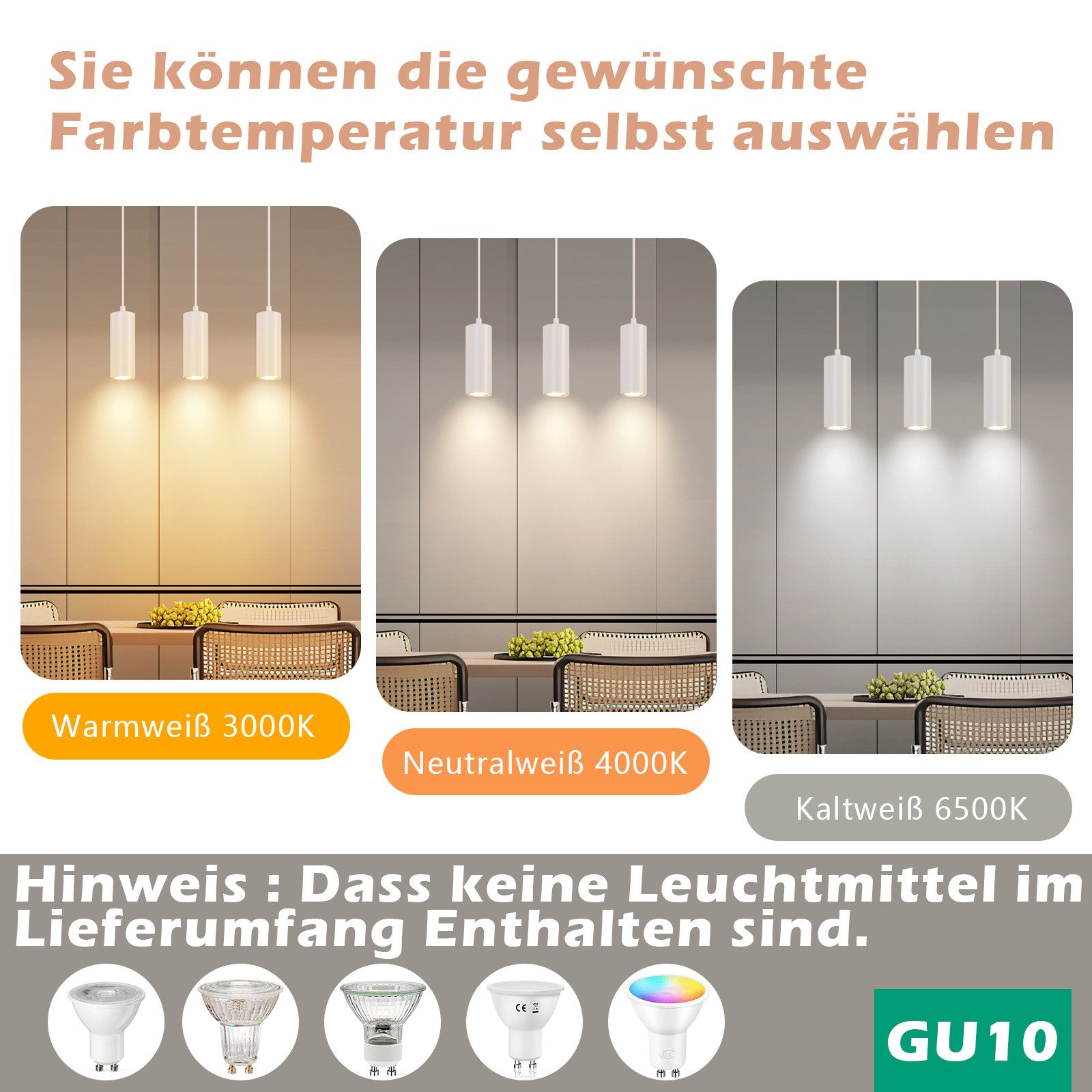 Tässä ruokapöydän riippuvalaisimessa on vakiomallinen GU10-kanta. Voit valita erilaisia lamppuja sisustaaksesi huoneesi sopivalla valon värillä ja tyylillä, kuten LED-lamppuja, hehkulamppuja tai värillisiä lamppuja. Huomautus: Keittiön riippuvalaisimet toimitetaan ilman lamppuja.