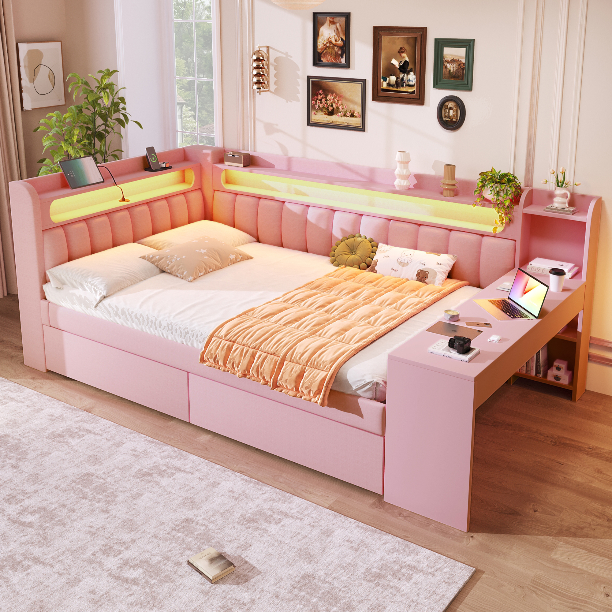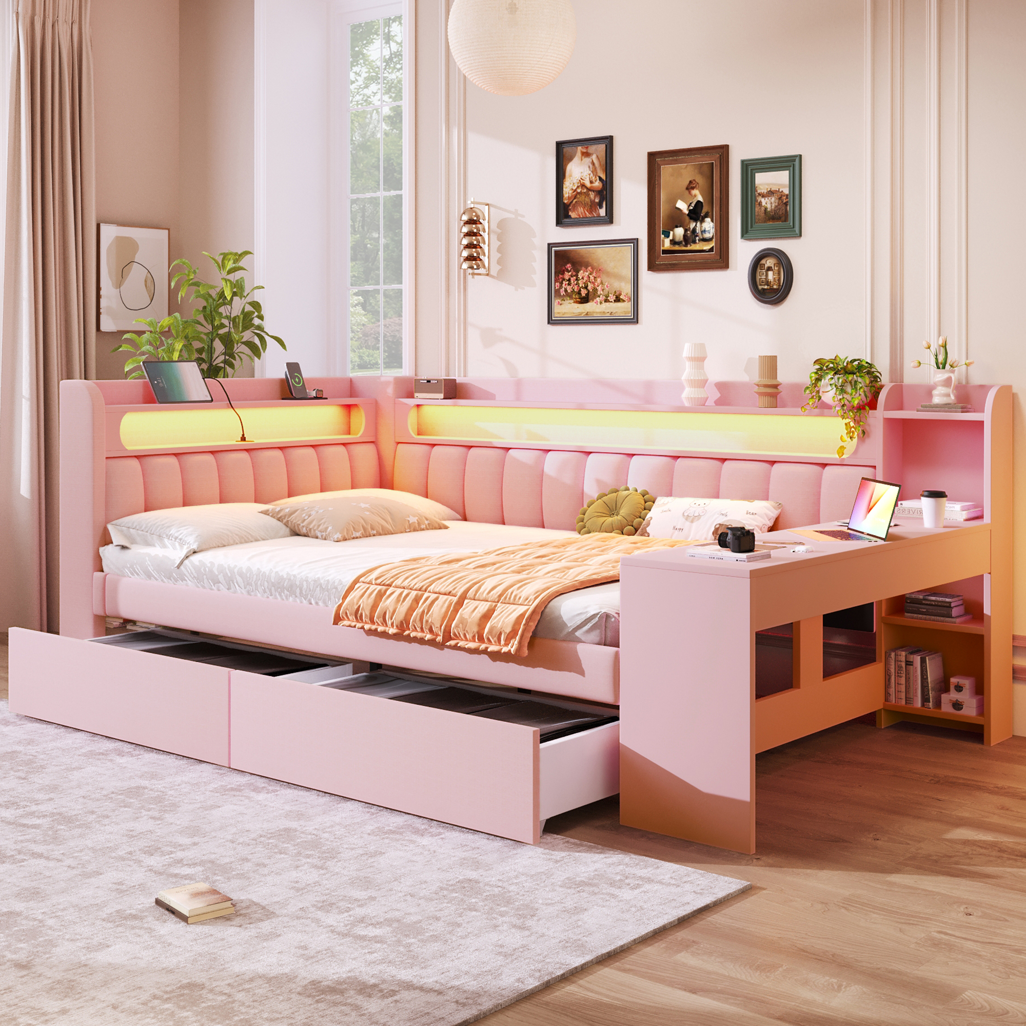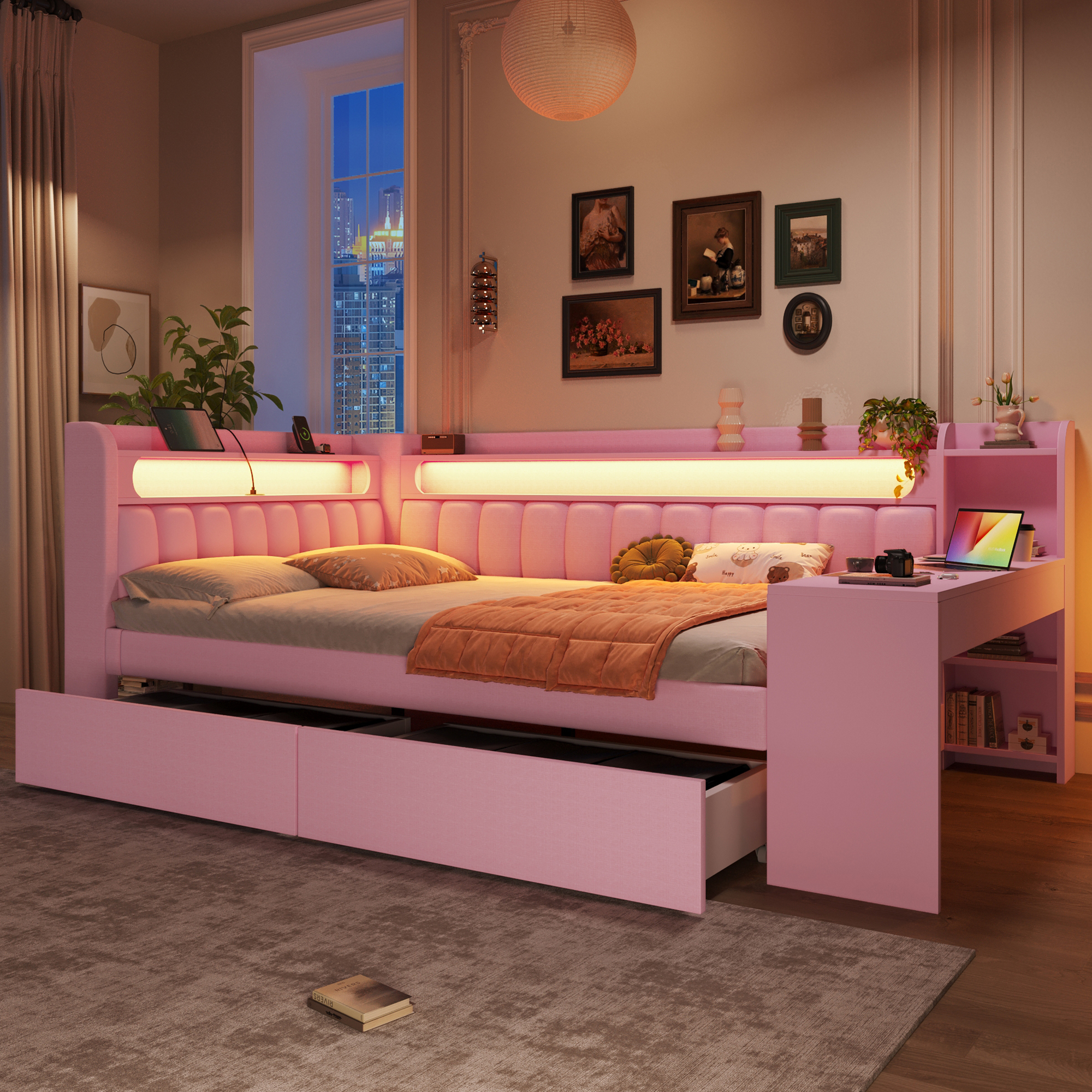 Vuodesohva 140x200, USB- ja LED-valoilla, työpöytä ja 2 laatikkoa, pinkki
