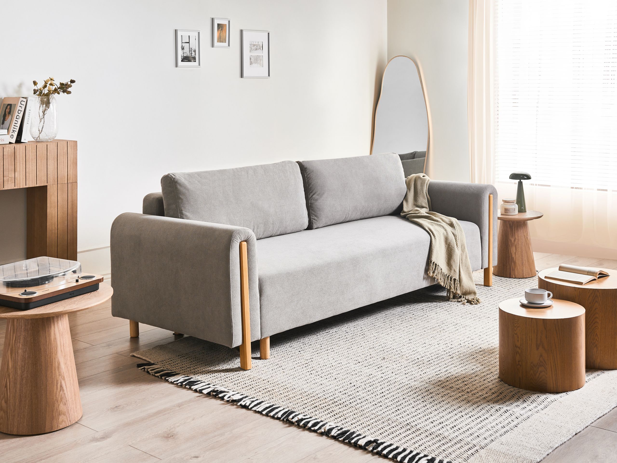 Verhoiltu sohva vuodetoiminnolla. Tämä tyylikäs vuodesohva yhdistää modernin muotoilun ja käytännöllisyyden. Se on verhoiltu kestävällä, vettä hylkivällä polyesterikankaalla, joka pitää vahingossa tapahtuvat roiskeet pinnalla ja helpottaa puhdistusta. Vankat kumipuusta valmistetut jalat ja runko tarjoavat erinomaisen vakauden ja luonnollisen, lämpimän tunnelman. Istuimen sisään kätketty tilava säilytyslokero sopii erinomaisesti ylimääräisten tekstiilien tai päivittäisten tarvikkeiden säilytykseen. Sohva muuntuu helposti mukavaksi nukkumapaikaksi yövieraille, mikä tekee siitä ihanteellisen valinnan myös pienempiin tiloihin.