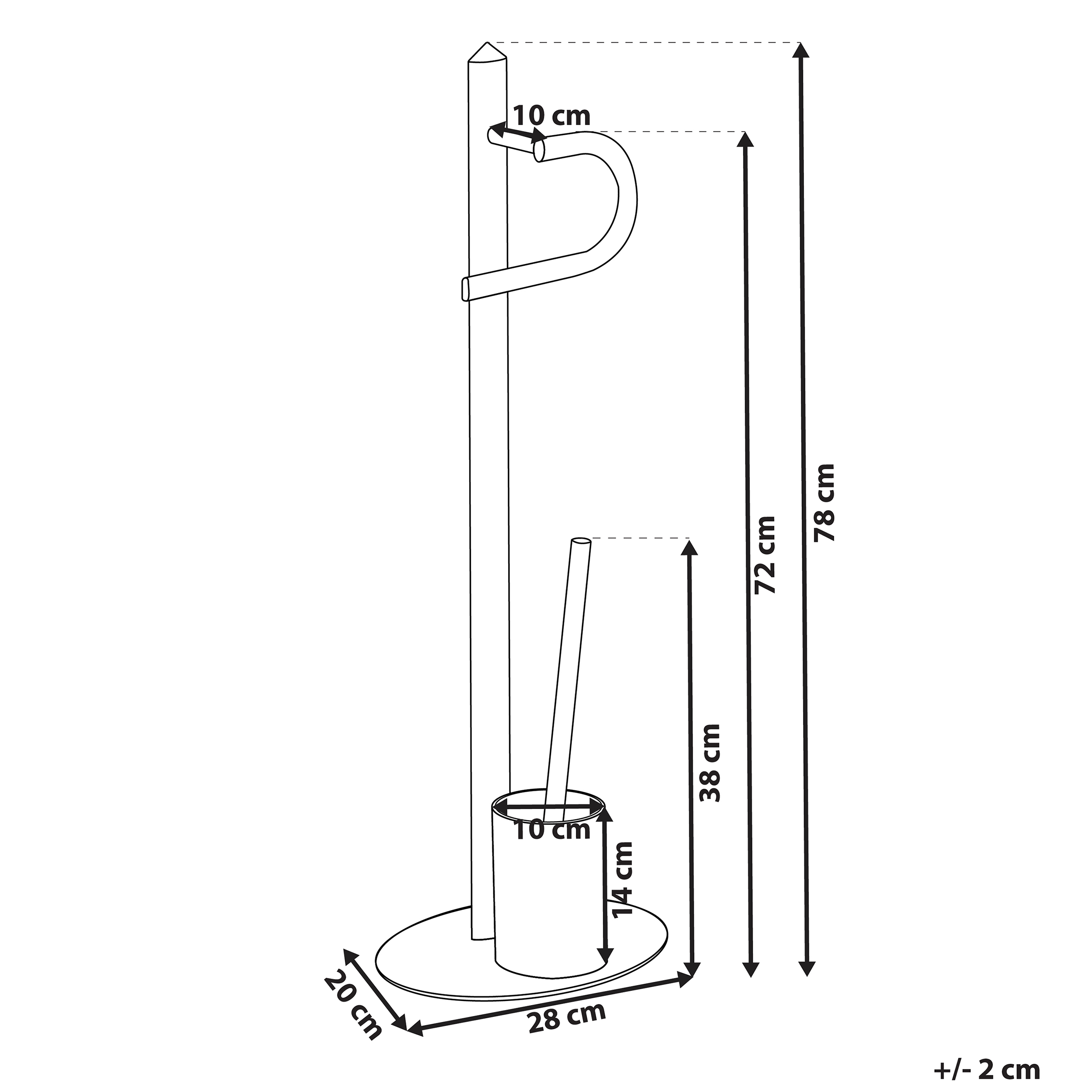 Moderni vessapaperi- ja harjateline. Tämä vessapaperiteline on kätevä sekä isoihin että pieniin kylpyhuoneisiin ja vessoihin tilan säästämiseksi. Teräksestä ja synteettisestä materiaalisesta valmistettu teline on kestävä ja tukeva. Se sisältää myös paikan vessaharjalle, mikä lisää toiminnallisuutta. Mattamustan viimeistelyn ansiosta vessapaperi- ja harjateline sopii sekä moderniin että perinteiseen sisustukseen.