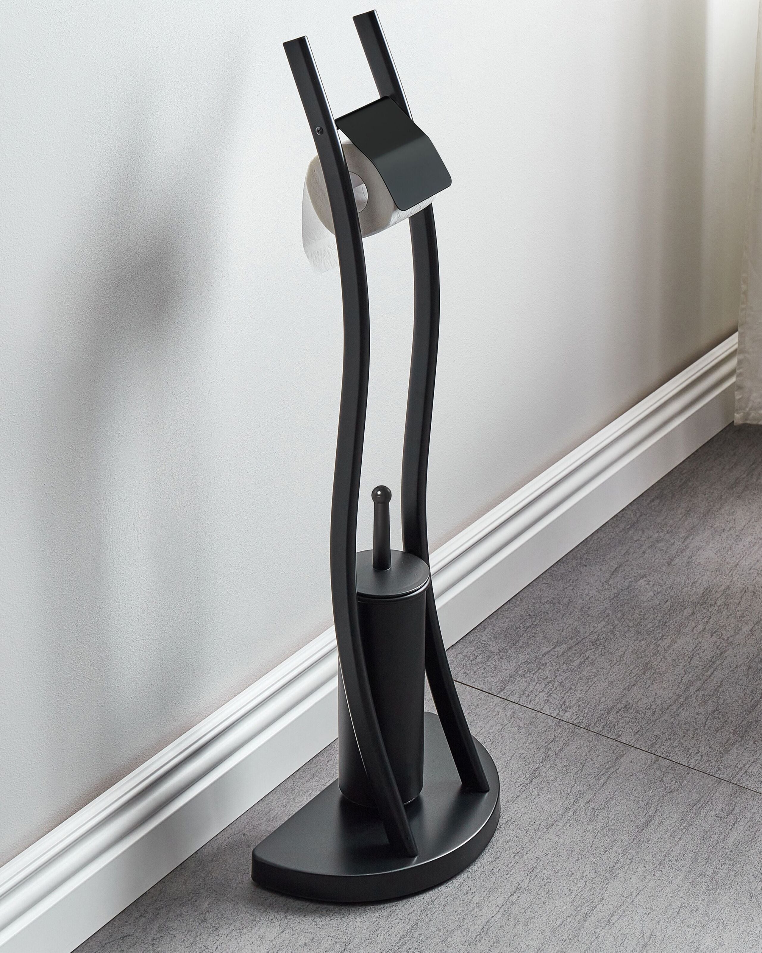 Moderni vessapaperi- ja harjateline. Kätevä sekä isoihin että pieniin kylpyhuoneisiin ja vessoihin tilan säästämiseksi. Korkealaatuisesta teräksestä valmistettu WC-paperi- ja harjateline on tukeva ja kestävä. Mustan matta viimeistelyn ansiosta teline sopii niin moderniin kuin perinteiseen sisustukseen.