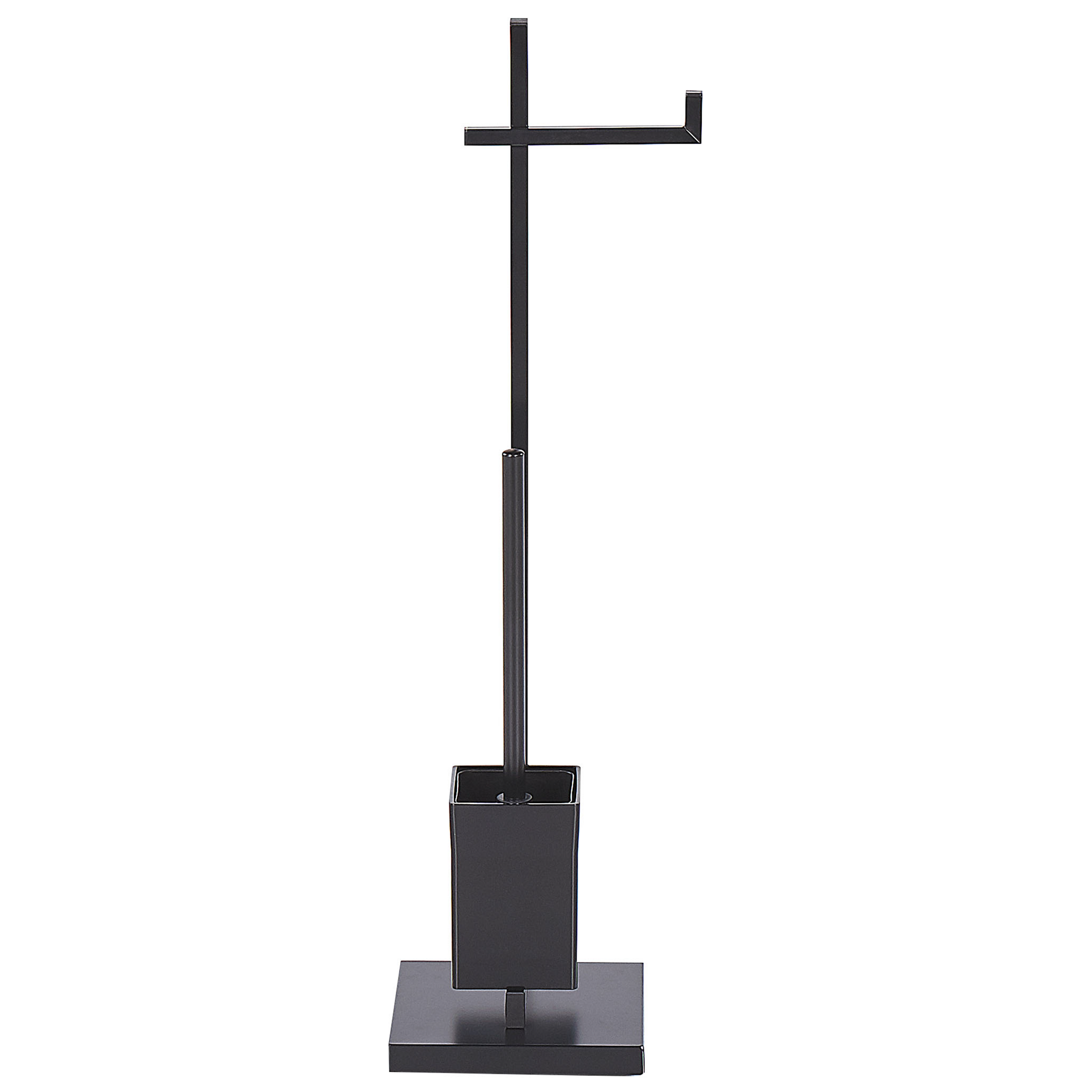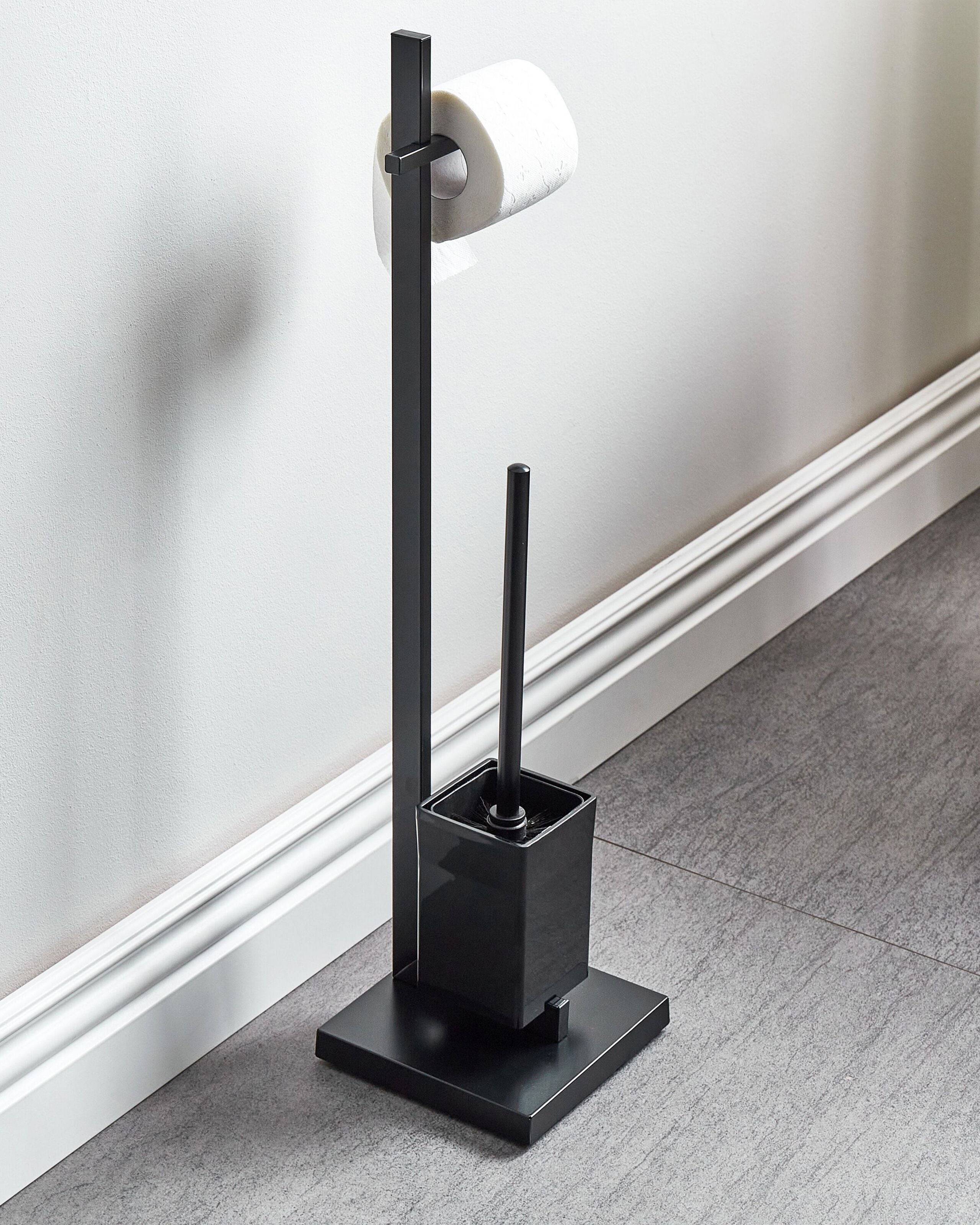 Moderni vessapaperi- ja harjateline. Varusta kylpyhuoneesi tai vessasi tällä tyylikkäällä WC-paperi- ja harjatelineellä. Teline on valmistettu laadukkaasta teräksestä, joka on helppohoitoista ja kestävää. Kauniin, kiiltävän mustan viimeistelyn ja yksinkertaisen muotoilun ansiosta teline sopii loistavasti moniin eri sisustuksiin ja voit yhdistää sen monien eri tarvikkeiden ja koristeiden kanssa.