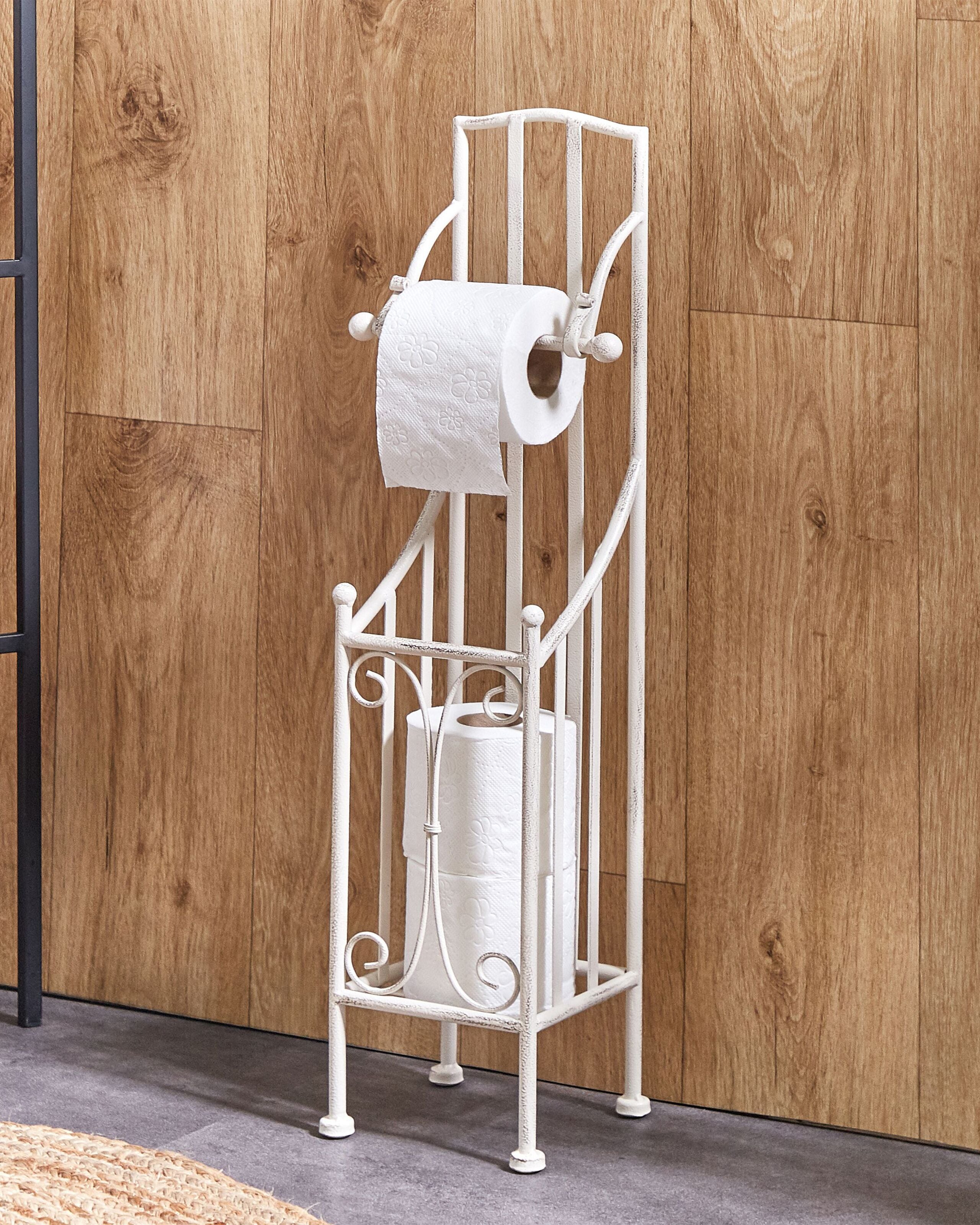 Retrotyylinen haalistunut vessapaperiteline säilytystilalla. Tämän retrotyylisen WC-paperitelineen ansiosta sinun ei tarvitse pelätä, että paperi loppuu kesken. Telineessä on säilytystila, johon mahtuu jopa kolme vessapaperirullaa kerralla. Teline on valmistettu korkealaatuisesta raudasta, joka kestää vuosien käytön. Sen valkoinen väri on tarkoituksella haalistuneen näköinen, mikä antaa telineelle vintagemaisen viimeistelyn.