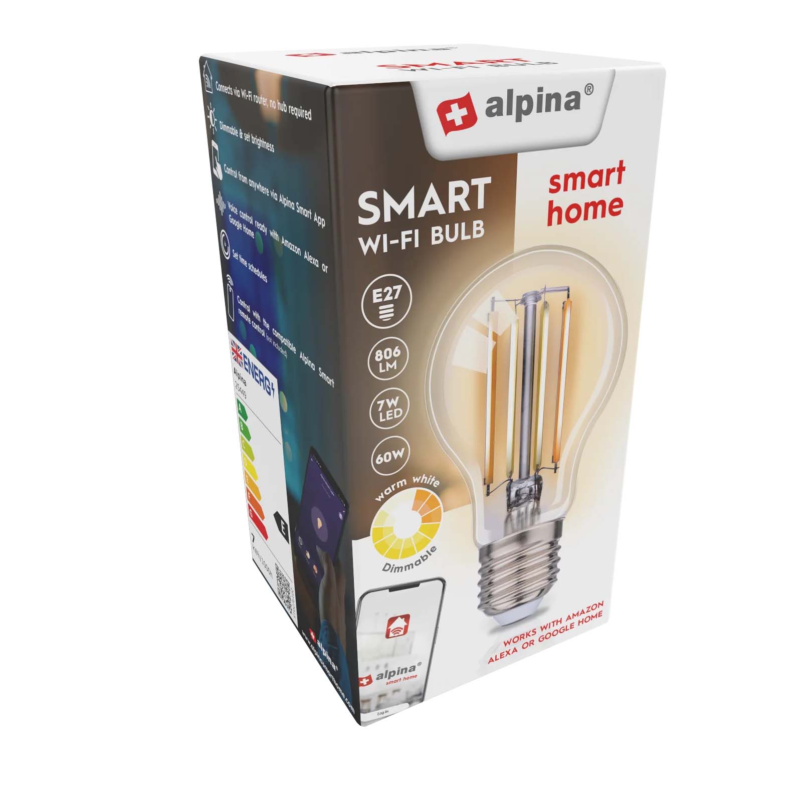 Tässä Alpina-kytkentäisessä lampussa on E27-kanta A60-muodossa, ja sen valovirta on 806 lumenia 4,9 W:n virrankulutuksella. LED-tekniikka korvaa perinteisen 60 W:n hehkulampun. Lämmin valkoinen valo vaihtelee 1800K:sta 2700K:een ja mukautuu kaikkiin valaistustunnelmiin. Wi-Fi-yhteys mahdollistaa suoran ohjauksen Alpina Smart -sovelluksella tai Alexan ja Google Home -palvelun äänikomennoilla.