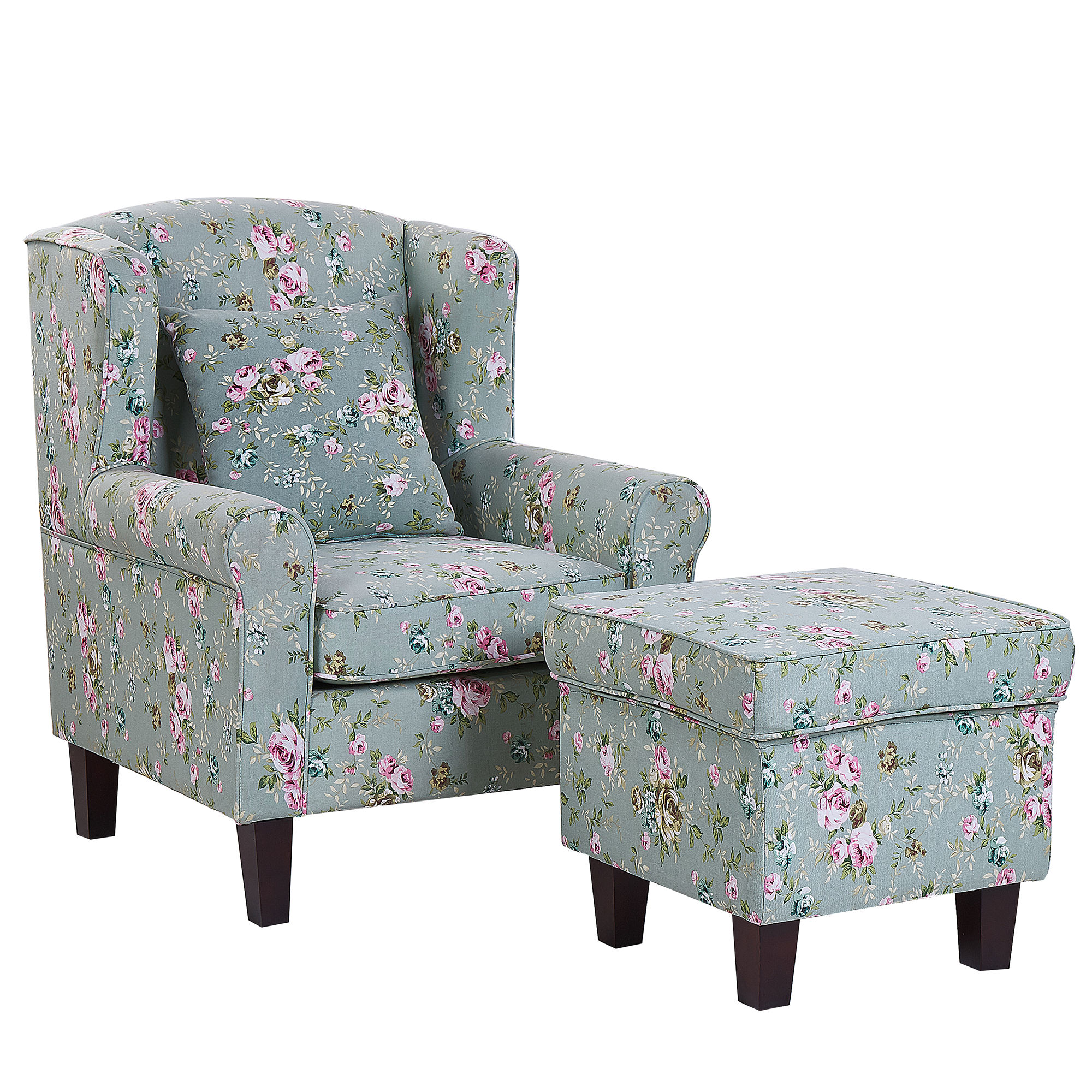 Mukava ja tyylikäs nojatuoli ja rahi. Viimeistele olohuoneesi tällä kauniilla nojatuolilla. Sen ainutlaatuinen muotoilu ja upea kukkakuvio sinisellä taustalla tekee siitä huonekalun, joka sopii erilaisiin sisustuksiin. Paksu istuin ja leveä selkänoja takaavat täydellisen mukavuuden ja jalat takaavat vakauden. Nojatuoliin kuuluu myös rahi ja tyyny jotka auttavat sinua rentoutumaan pitkän ja stressaavan päivän jälkeen.
