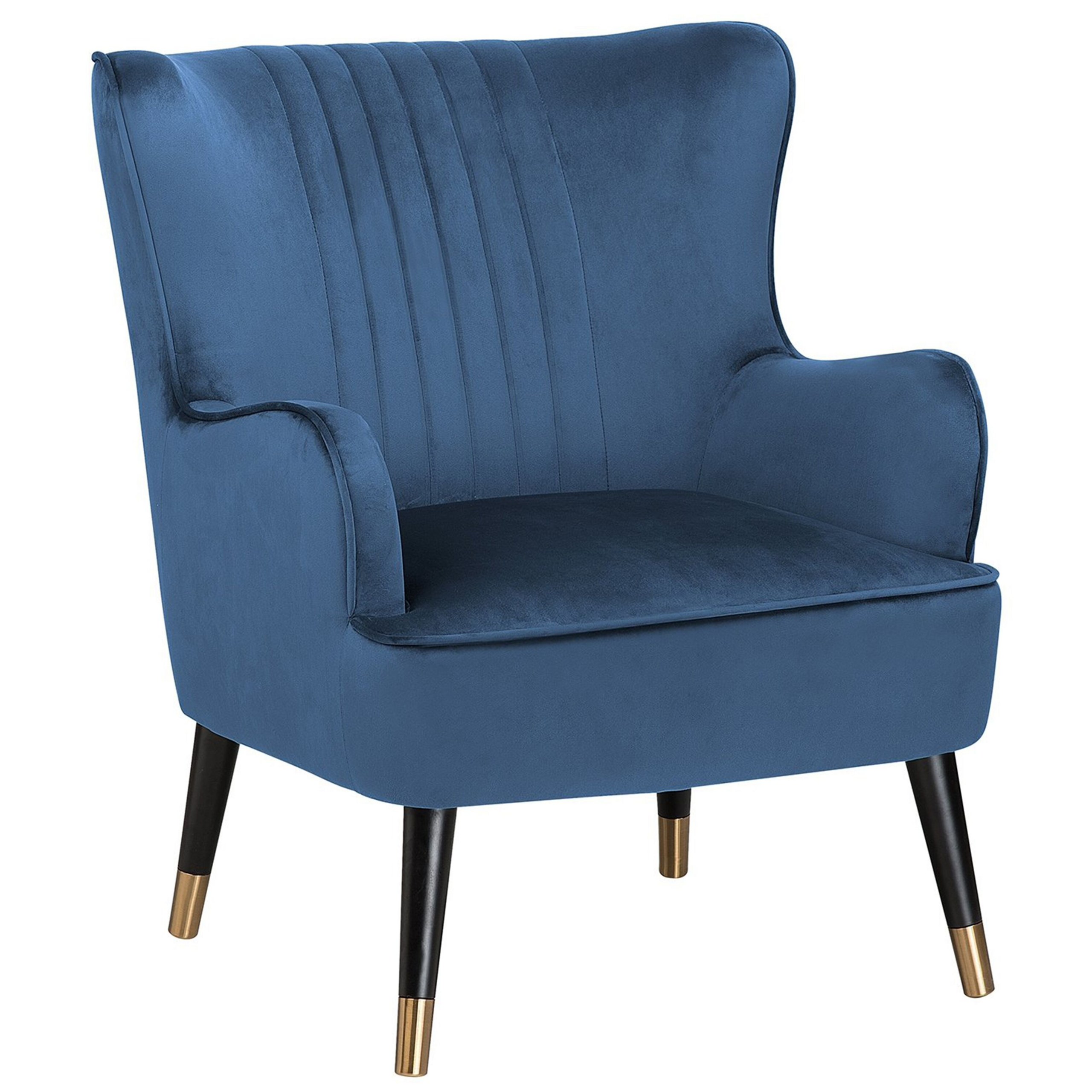 Kaunis samettinen nojatuoli. Tuo tilaasi vintage-tunnelmaa tällä tyylikkäällä wingback-tuolilla. Nojatuoli on verhoiltu pehmeällä ja helppohoitoisella, tummansinisellä samettikankaalla, ja sen paksusti pehmustettu istuin takaa parhaan mahdollisen istumamukavuuden. Wingback-muoto ja kaltevat käsinojat tuovat tuoliin tyylikkään ilmeen, joten se sopii täydellisesti glamour-tyylisiin tai perinteisiin sisustuksiin.