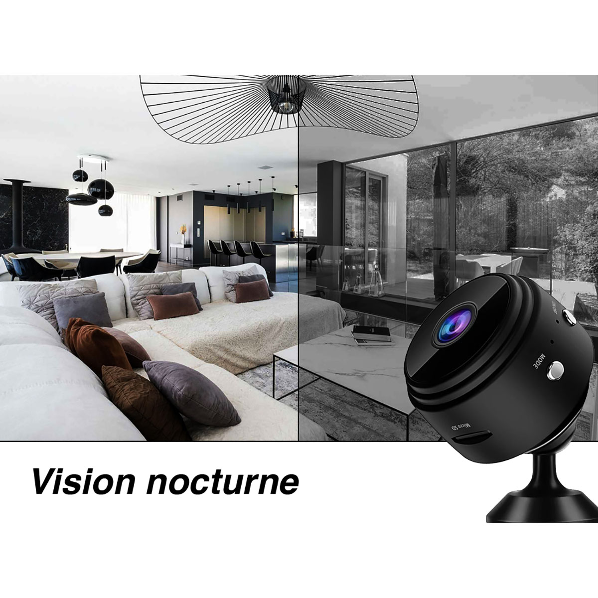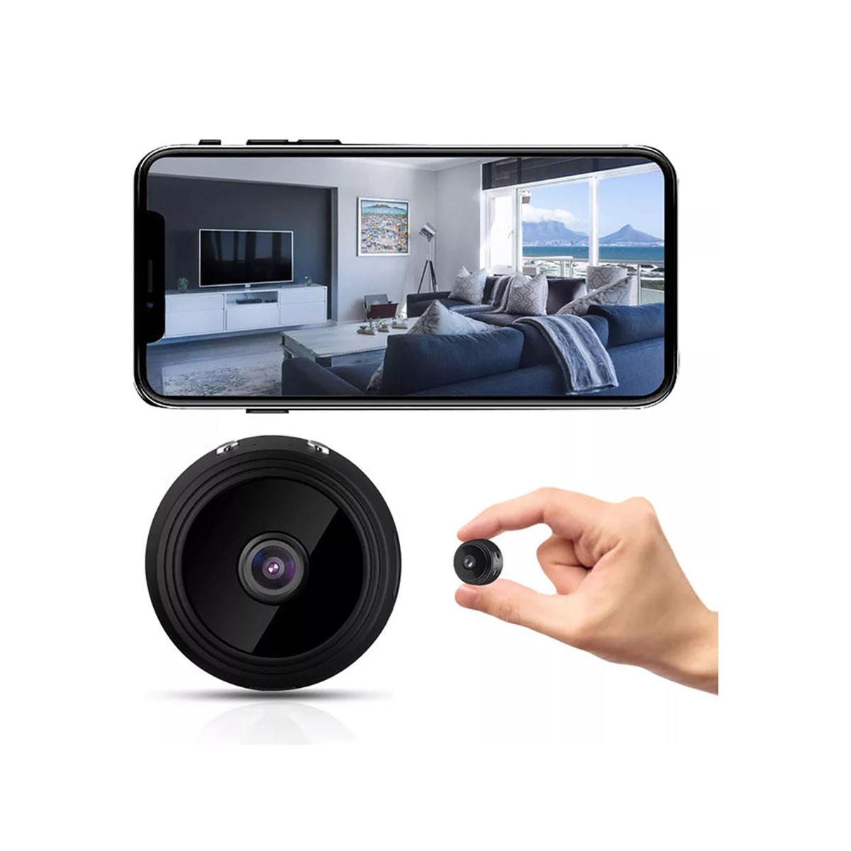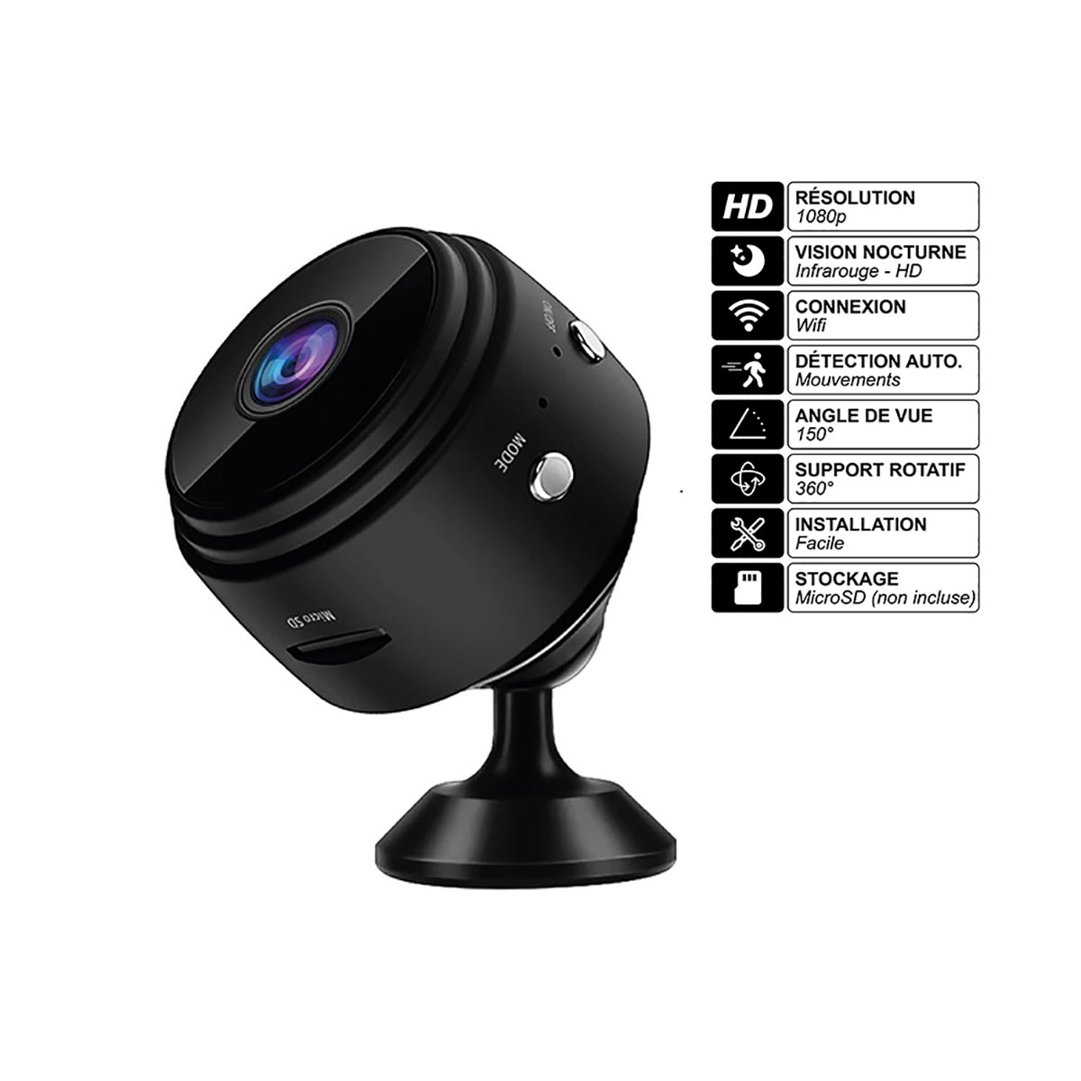 Pidä kotiasi huomaamattomasti silmällä tämän mini HD-vakoilukameran avulla. Siinä on infrapuna-yökuvaus, automaattinen liikkeentunnistus ja Wi-Fi-yhteys etäkatselua varten. Sen 150° katselukulma ja 360° kääntyvä kiinnike takaavat optimaalisen kattavuuden. Helppo kätkeä, se sopii täydellisesti kotiin tai toimistoon. Paristo- tai USB-käyttöinen.