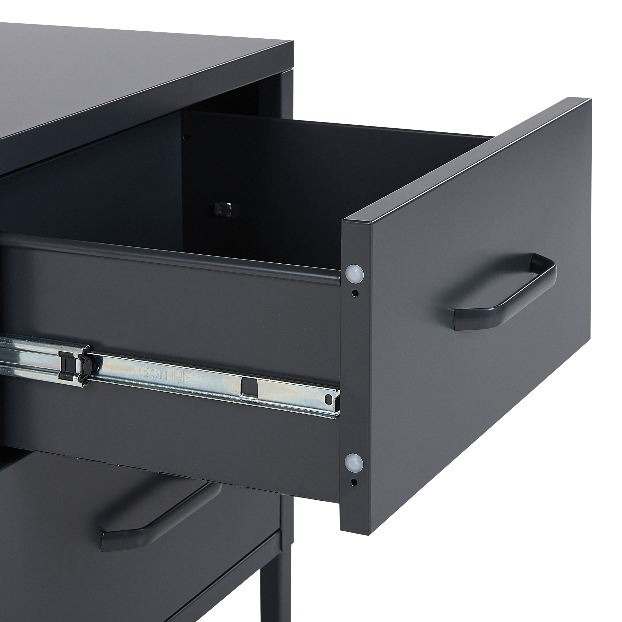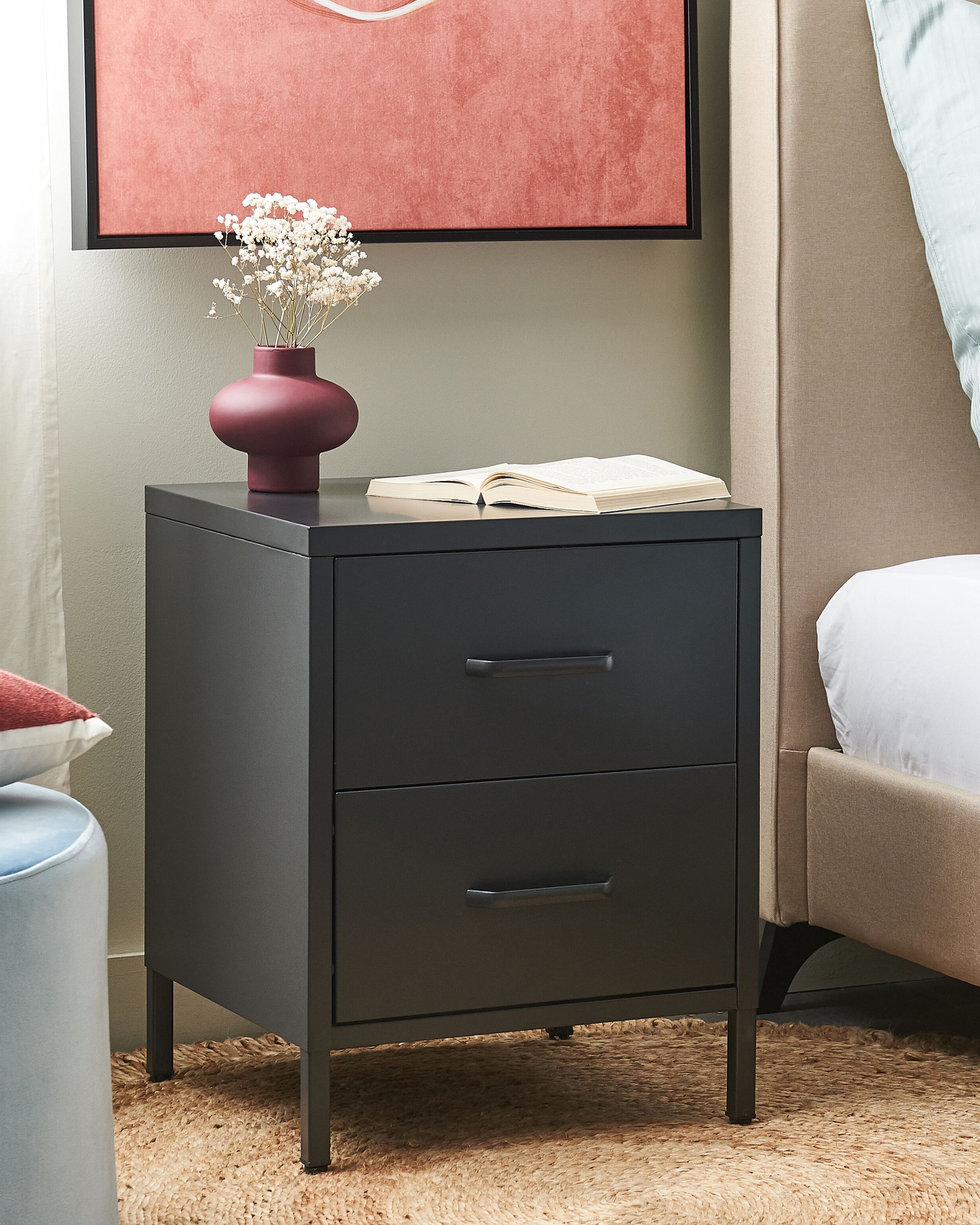 Industriaalinen sivupöytä laatikoilla. Tämä laatikoilla varustettu yöpöytä on välttämätön osa makuuhuonetta. Kestävästä ja helppohoitoisesta teräksestä valmistettu yöpöytä on vankka. Kaksi tilavaa laatikkoa tarjoaa paljon säilytystilaa monille eri tavaroille. Jaloissa olevat muovitapit suojaavat lattiaa naarmuilta. Grafiitinharmaa väri ja tyylikäs muotoilu tekevät pöydästä täydellisen lisän minkä tahansa tyyliseen makuuhuoneeseen.