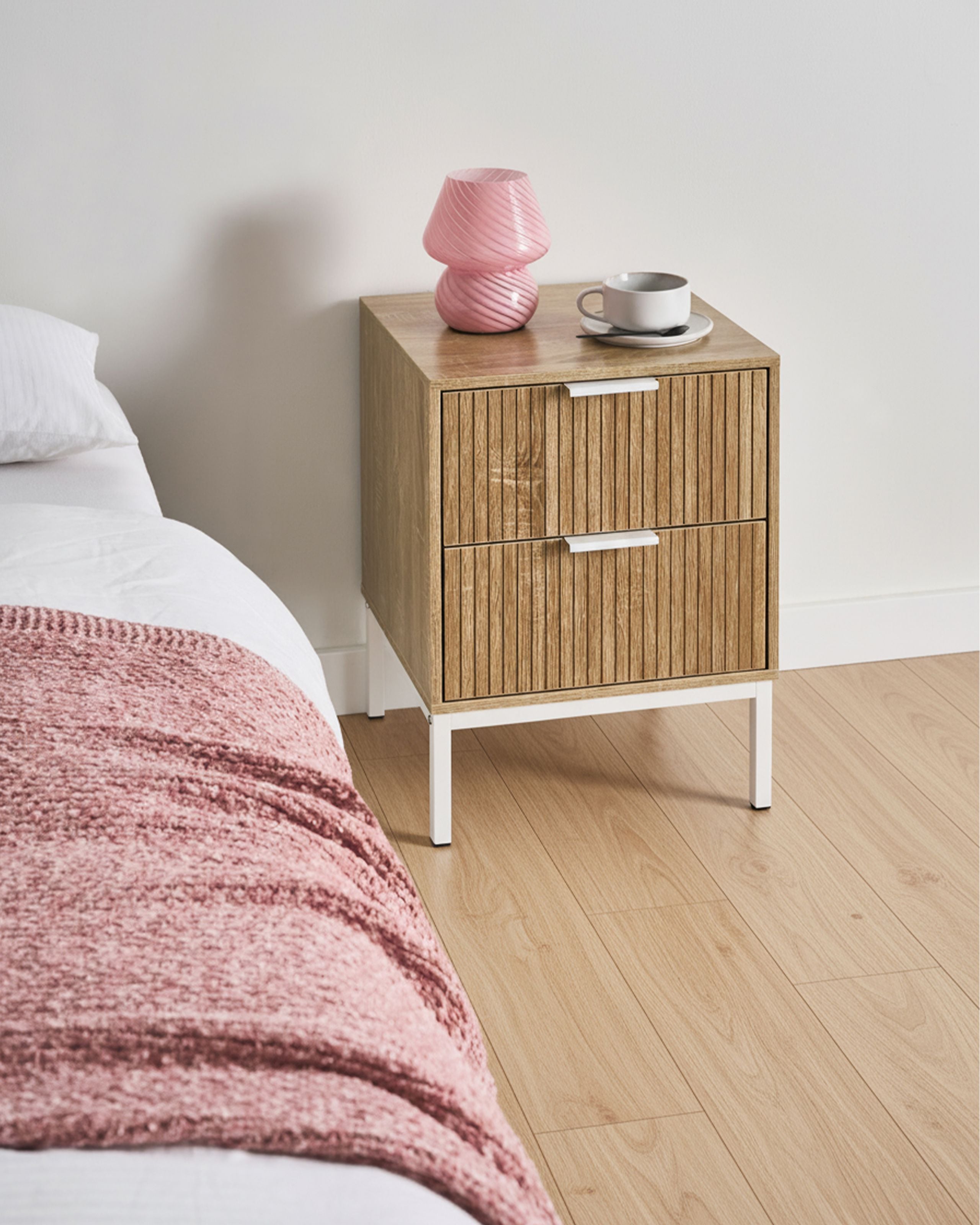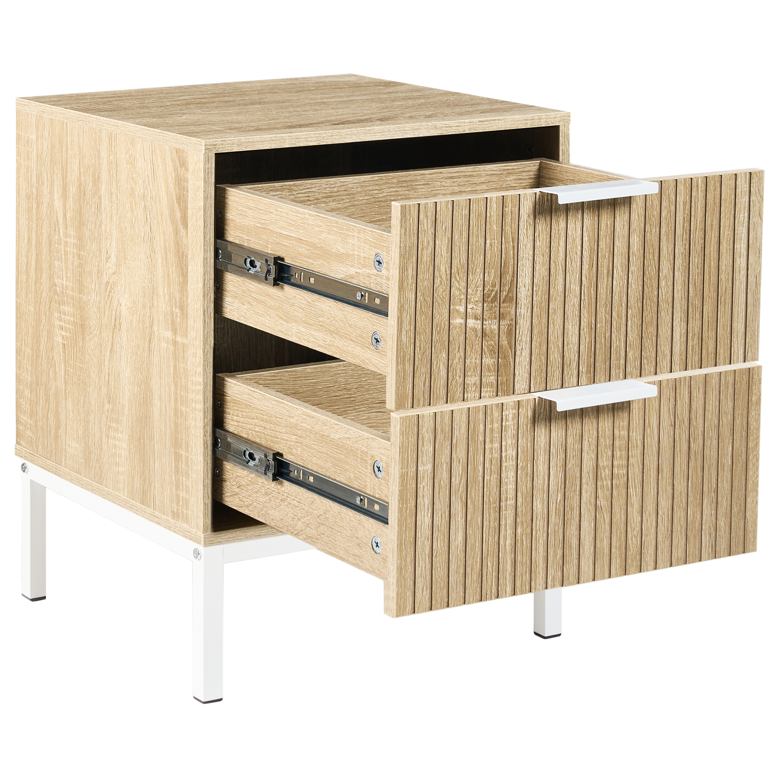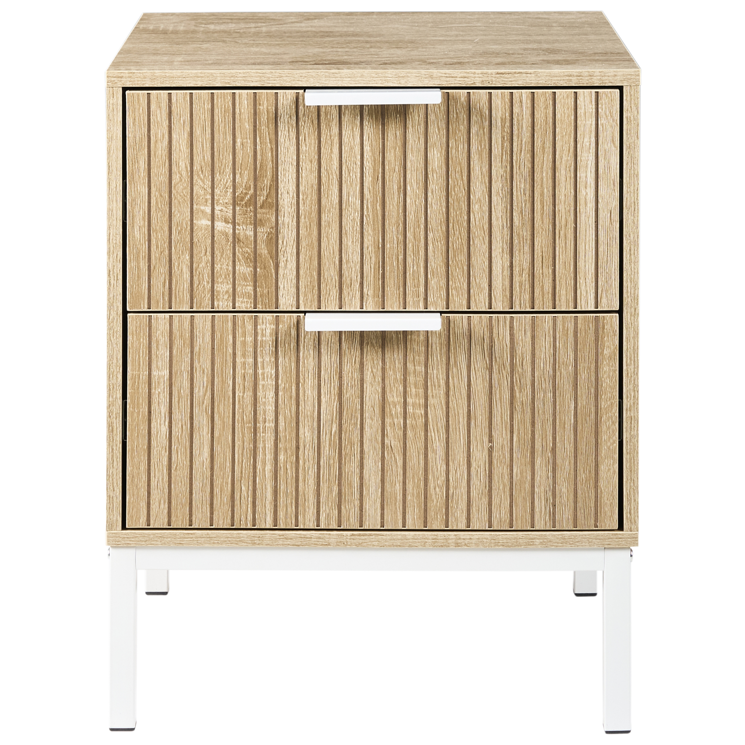 Moderni yöpöytä uurretuilla vetolaatikoilla. Tämä tyylikäs yöpöytä yhdistää puhtaan skandinaavisen muotoilun ja käytännöllisen toiminnallisuuden. Kestävistä MDF-levystä ja lastulevystä valmistetussa pöydässä on kaksi laatikkoa, jotka tarjoavat kätevän säilytystilan sängyn vieressä. Vankat, minimalistiset rautajalat ja -kahvat antavat pöydälle hienostuneen ilmeen ja tekevät siitä täydellisen valinnan mihin tahansa moderniin makuuhuoneeseen.