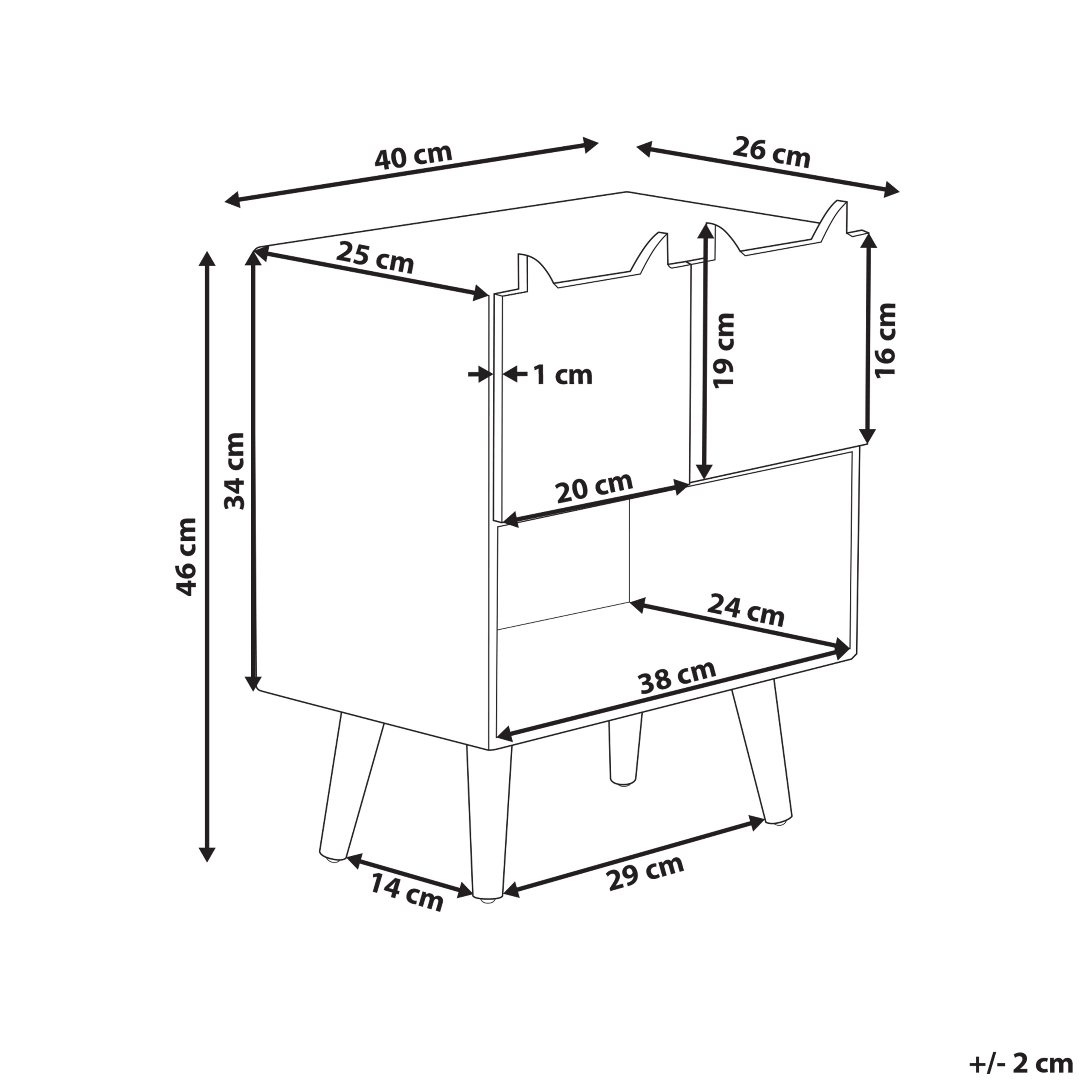 Söpö eläinaiheinen yöpöytä lastenhuoneeseen. Lisää lasten makuuhuoneeseen ripaus leikkisyyttä tällä viehättävällä yöpöydällä. Pöydässä on kaksi laatikkoa, joita koristavat suloiset eläinaiheiset kasvot, sekä tilava hylly. Luonnollista puuta jäljittelevä viimeistely antaa sille kauniin ilmeen, joka on helppo sulauttaa osaksi mitä tahansa sisustusta. Yöpöytä sopii täydellisesti sängyn viereen, pitäen tarpeelliset esineet käden ulottuvilla, tai leikkihuoneen pikkupöydäksi, johon on helppo piilottaa aarteet. Se on ihastuttava ja käytännöllinen lisä mihin tahansa viihtyisään lastenhuoneeseen.