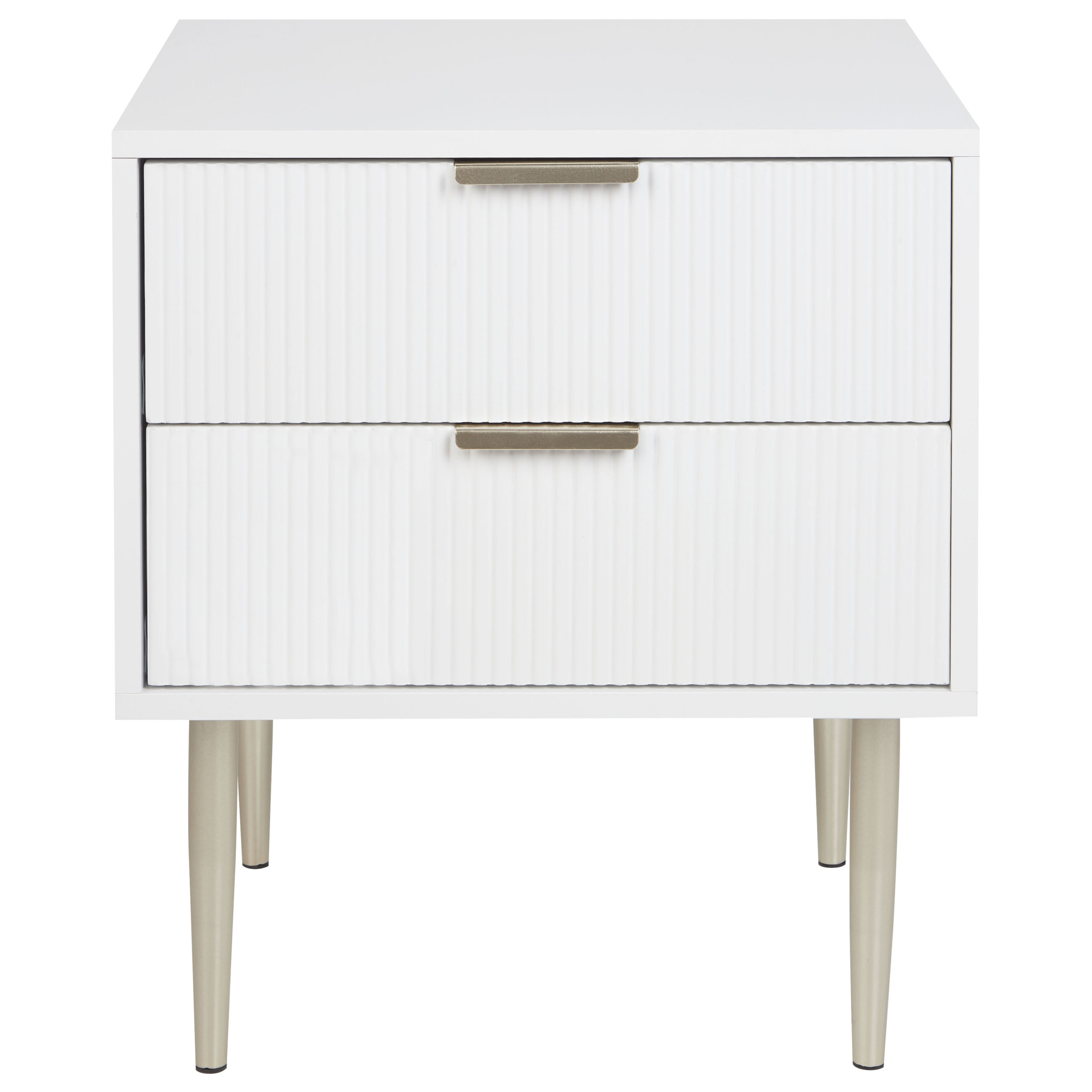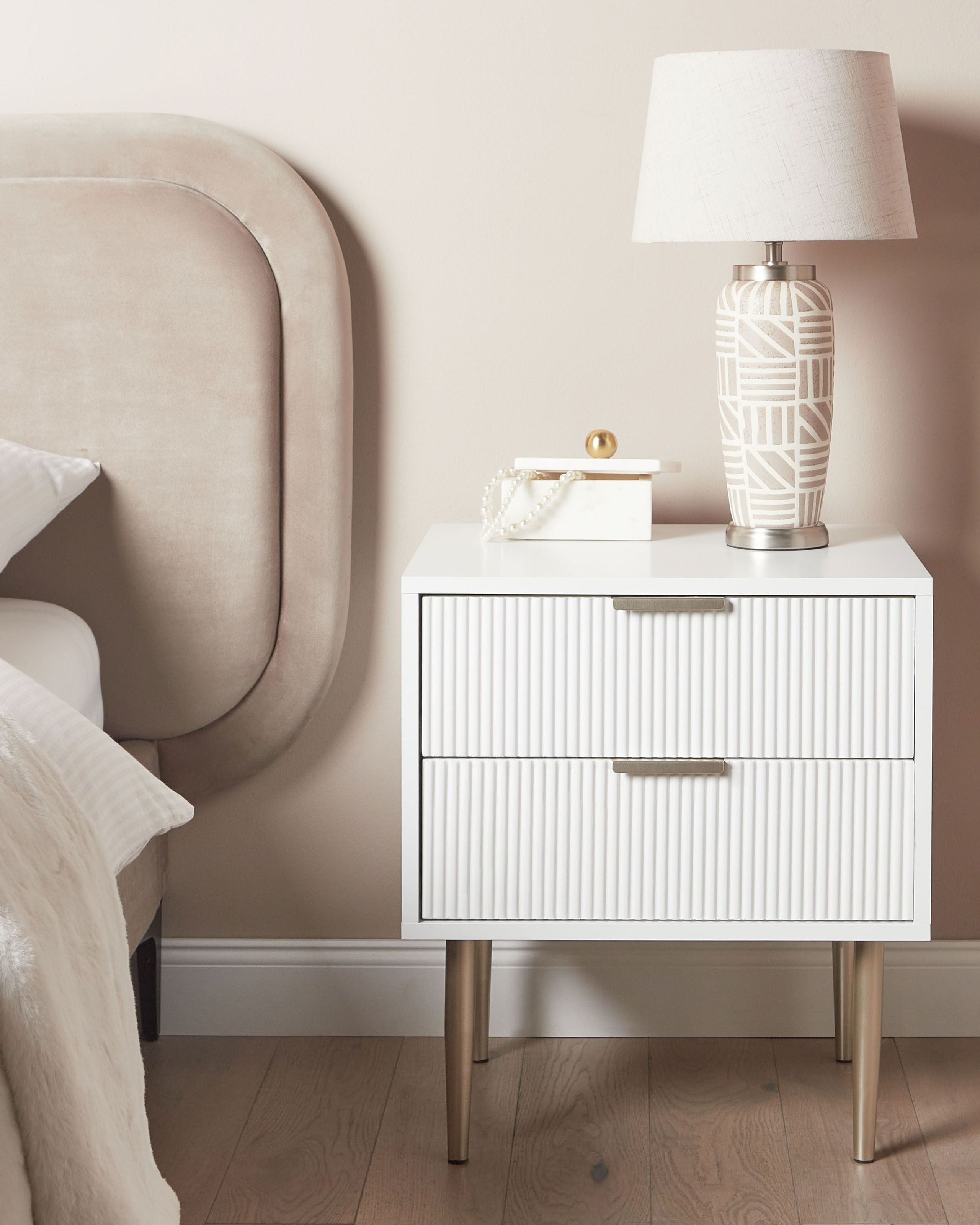 Moderni yöpöytä kahdella laatikolla. Lisää sisustukseen ripaus glamourin tuntua tällä minimalistisella yöpöydällä. Kestävästä materiaalista valmistettu pöytä on tyylikäs ja kestää hyväkuntoisena useita vuosia. Muotoilunsa ja laatikoiden uurteisen vaikutelman ansiosta se täydentää täydellisesti kaikkia makuuhuoneita eri sisustustyyleissä, nykyaikaisesta glamouriin. Pöytä ei ole vain huoneesi keskipiste, vaan se on myös toimiva säilytysratkaisu.