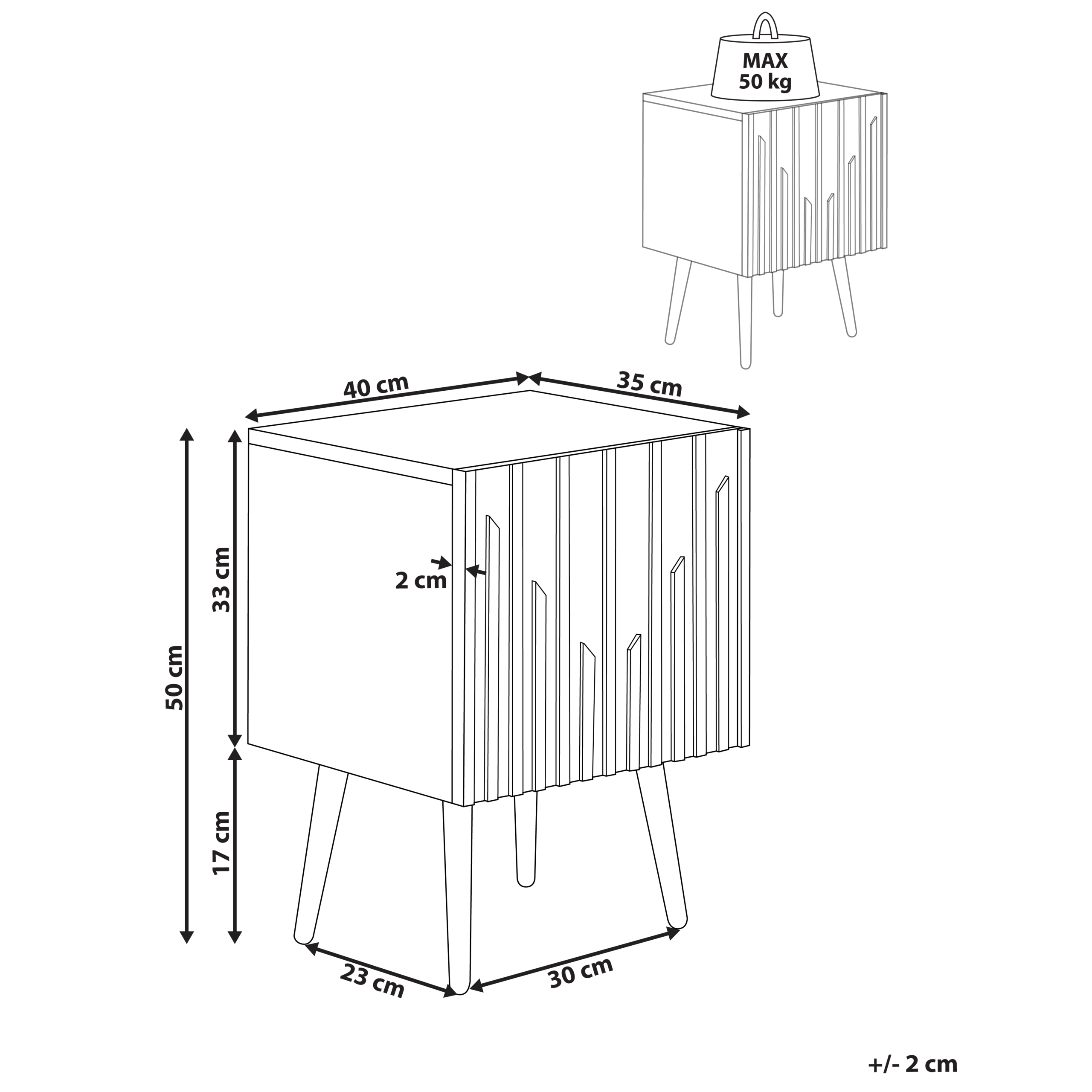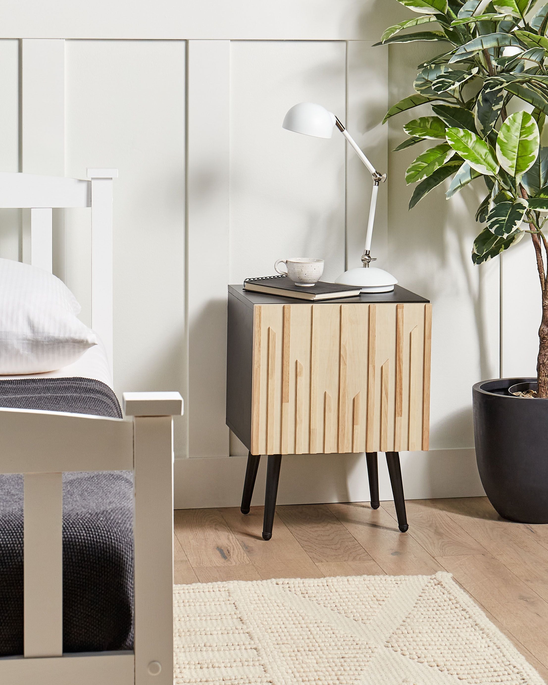Moderni yöpöytä säilytystilalla. Tässä tyylikkäässä yöpöydässä yhdistyvät musta melamiiniviimeistelty MDF-runko ja vaalea massiivikumipuuovi, joka tuo ripauksen luonnollista eleganssia. Rautajalat lisäävät modernia särmää, ja puhtaat linjat sekä minimalistinen muotoilu tekevät yöpöydästä täydellisen mihin tahansa nykyaikaiseen makuuhuoneeseen. Tämän yöpöydän käytännöllinen säilytystila ja tyylikäs muotoilu täydentävät vaivattomasti mitä tahansa modernia kotia.
