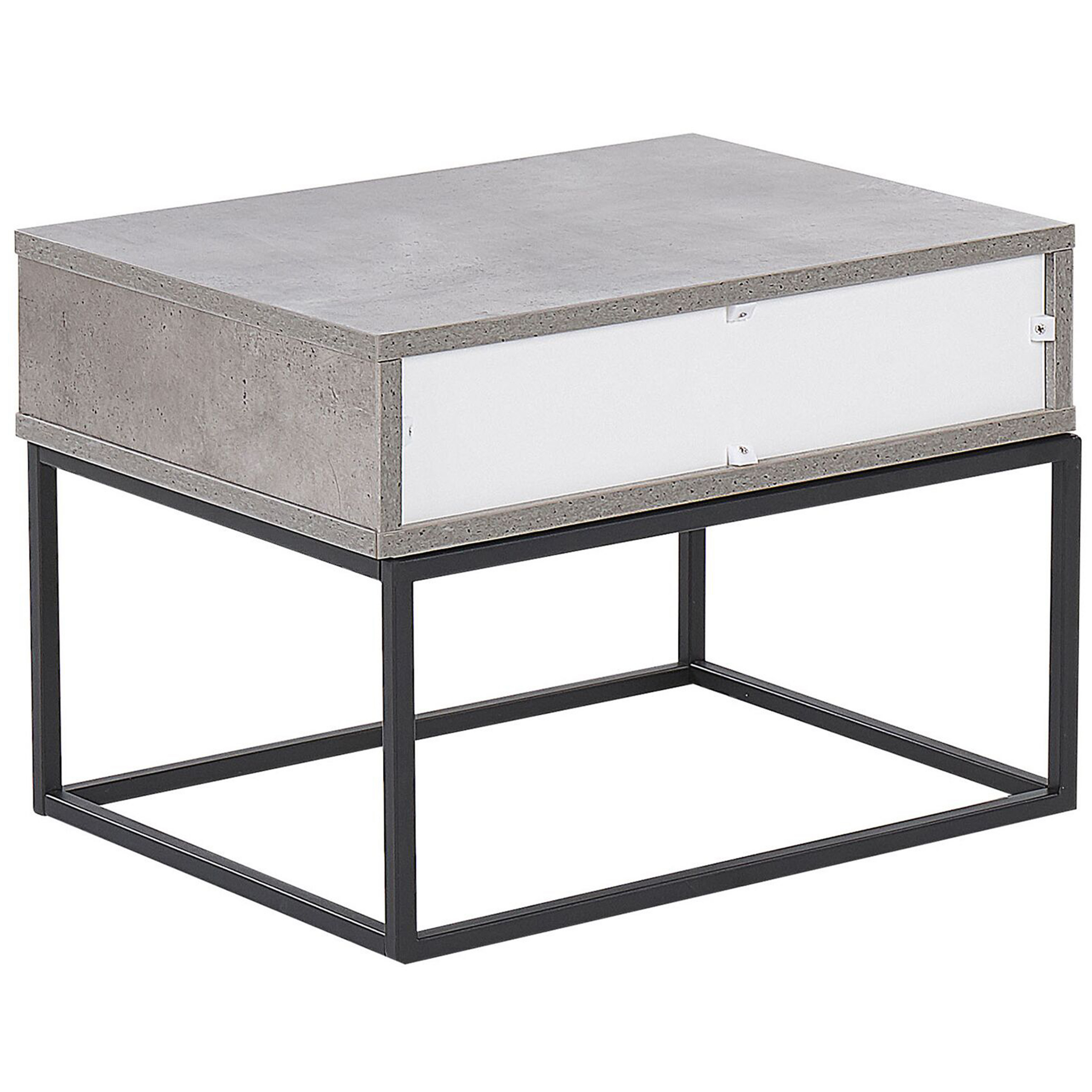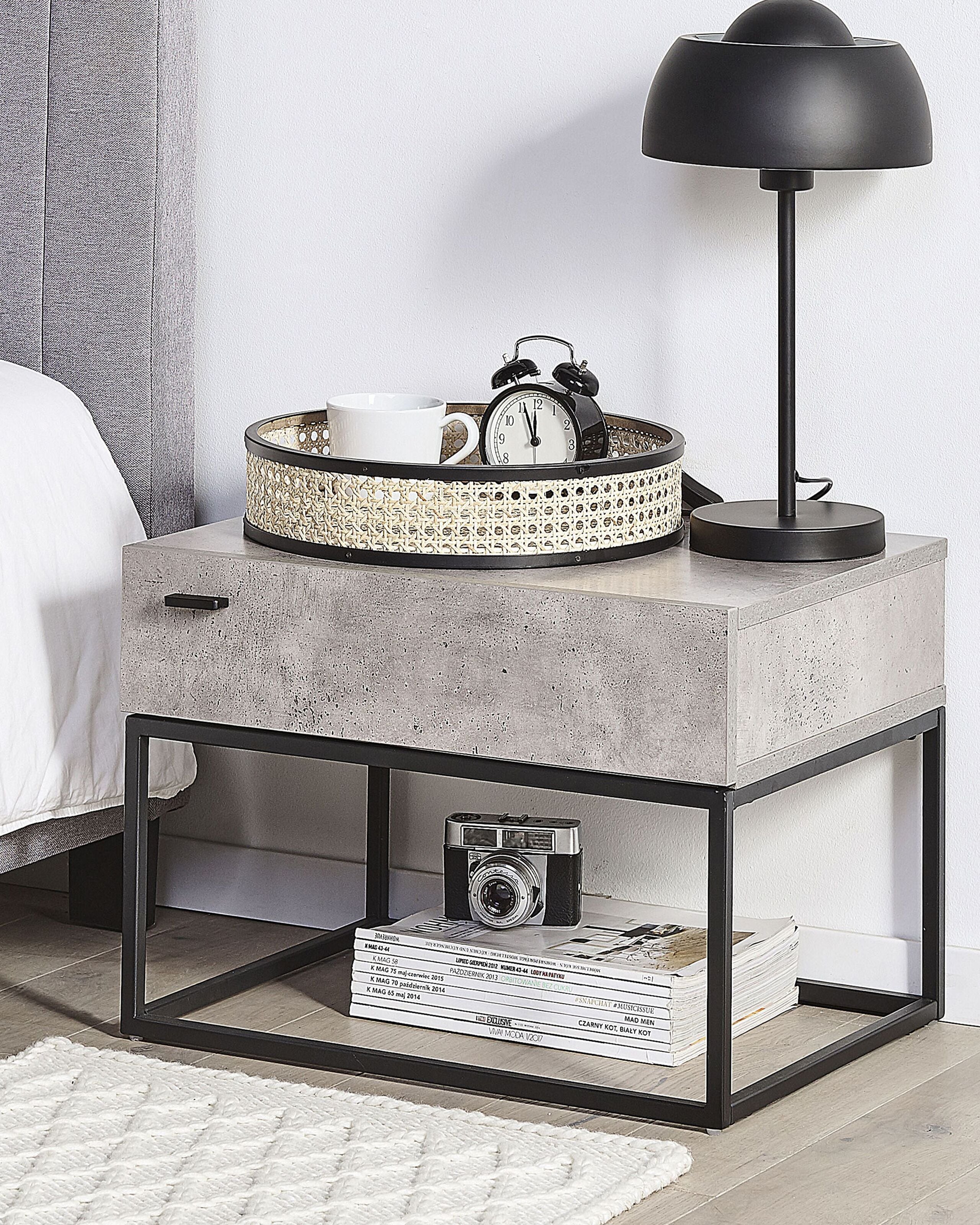 Industriaalinen sivupöytä. Yöpöytä voi olla paljon enemmän kuin säilytyspaikka herätyskellolle, kirjalle tai valaisimelle. Tämä yöpöytä on malliltaan poikkeuksellisen yksinkertainen ja elegantti. Yöpöytä on pinnoitettu betoniefektillä ja siinä on tukeva runko jauhemaalatusta, mustasta metallista. Materiaalien yhdistelmän ansiosta tämä yöpöytä sopii hyvin moderniin tai vaikka teolliseen sisustustyyliin. Tämä yöpöytä on täydellinen valinta jokaiselle, joka rakastaa persoonallisia huonekaluja.