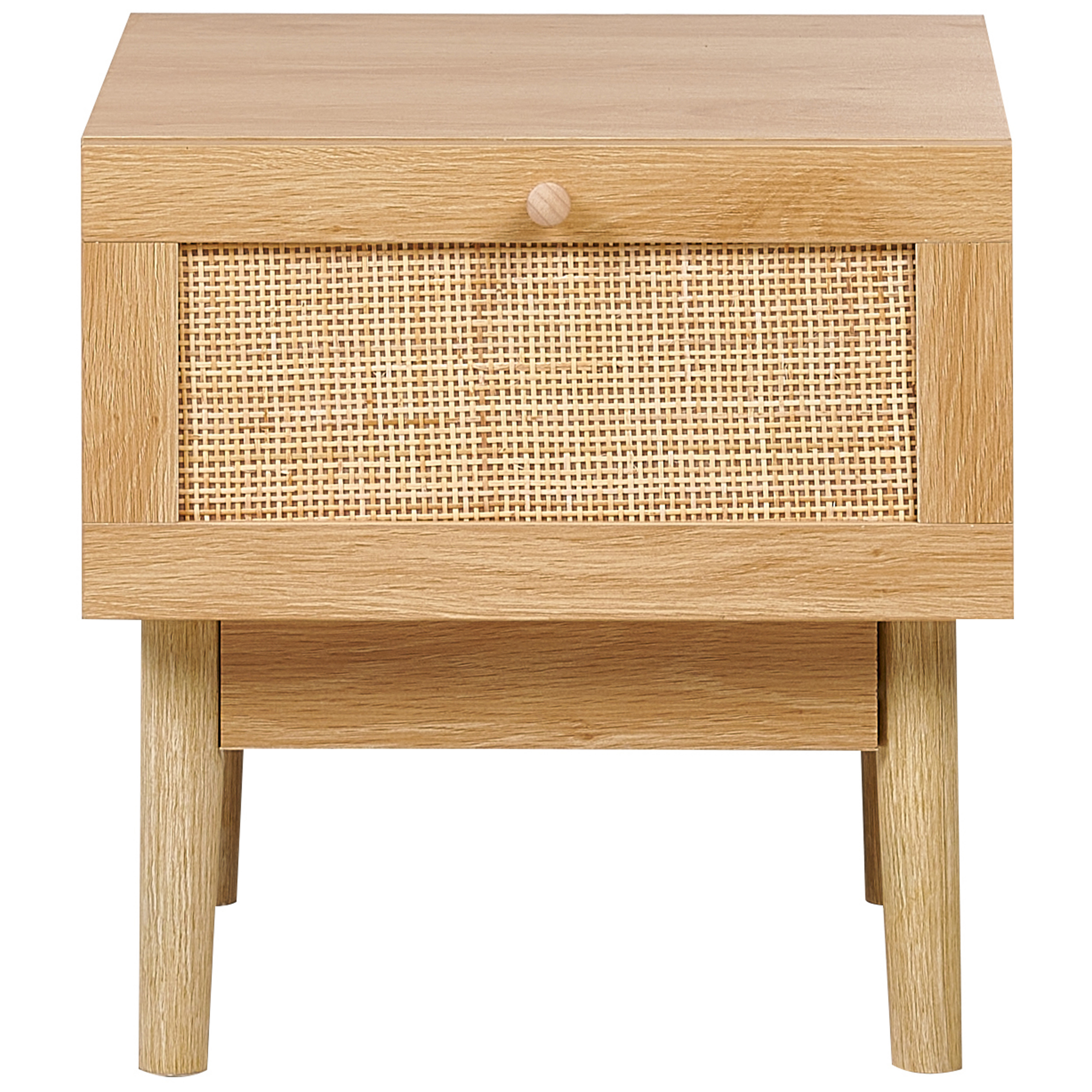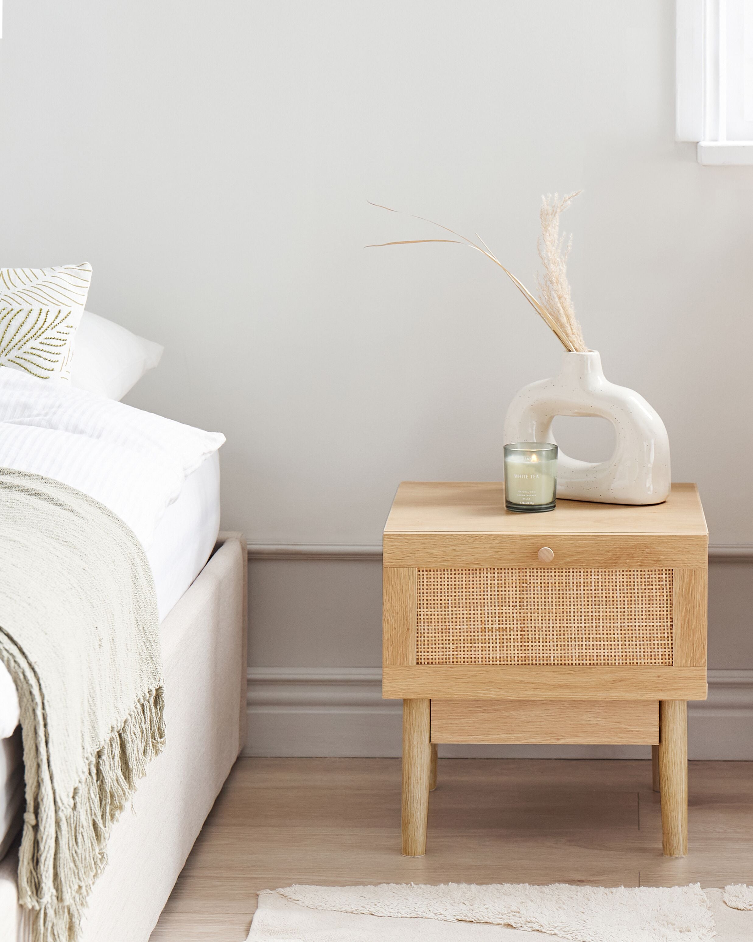 Boheemi yöpöytä rottinkiverkolla. Lisää makuuhuoneeseen ripaus boheemia maalaistunnelmaa tällä yöpöydällä, jonka runko on kestävää lastulevyä ja vankat jalat mäntyä. Upean luonnollisen, vaalean sävynsä ansiosta se on helppo sijoittaa osaksi monia sisustustyylejä. Rungon laadukas melamiiniviimeistely takaa pitkäikäisyyden, kun taas rottinkiverkolla koristeltu laatikko lisää käytännöllisyyttä ja esteettisyyttä. Pöytä sopii erinomaisesti luomaan kodikkaan ja viehättävän tunnelman makuuhuoneeseen.