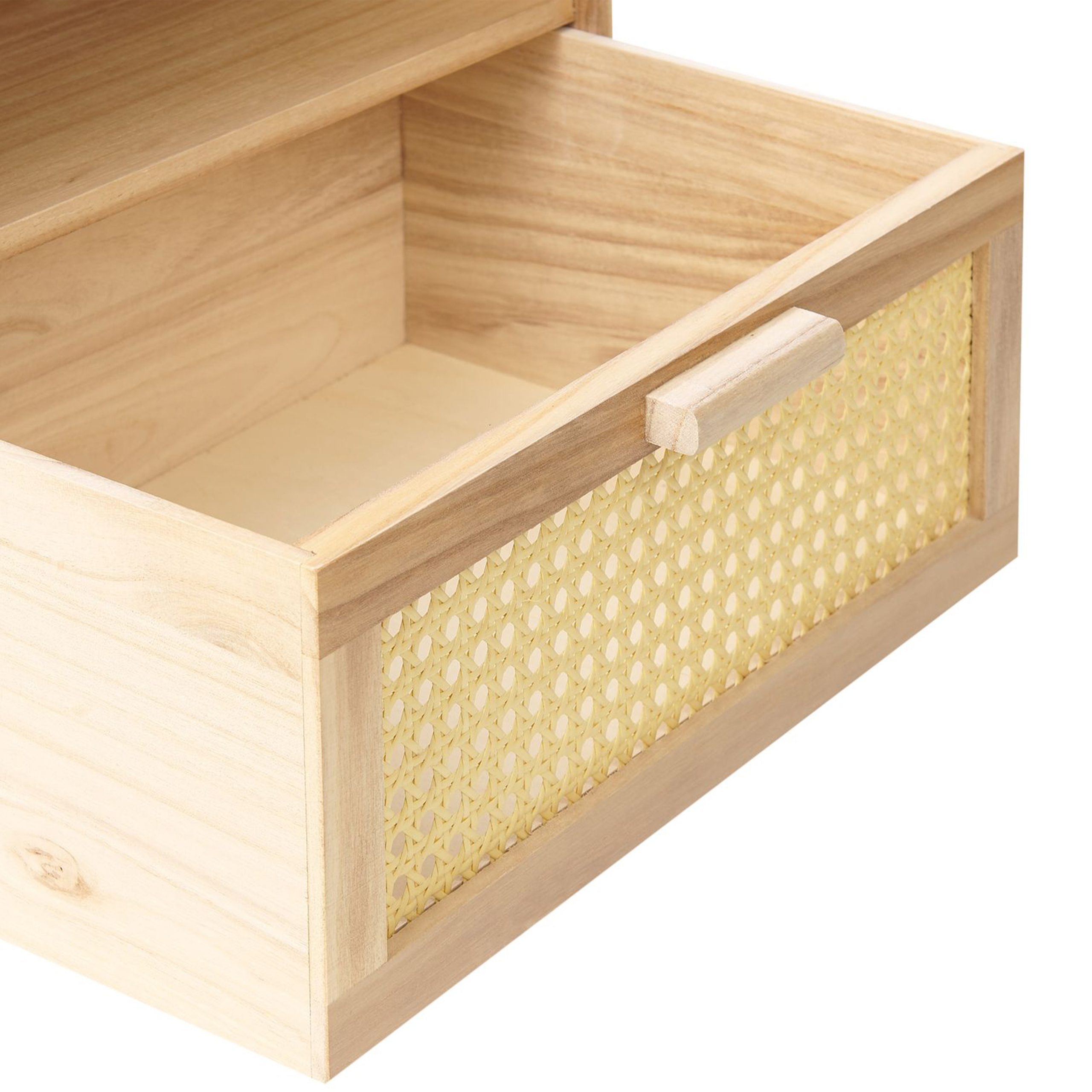 Rustiikkinen sivupöytä rottinkipunoksella. Kohota makuuhuoneesi ilmettä tällä tyylikkäällä, katseita keräävällä yöpöydällä. Luonnollisesta mutta kestävästä keisaripuusta ja rottinkipunoksesta valmistettu pöytä sulautuu täydellisesti rustiikkisiin tai boho-tyylisiin sisustuksiin. Lisäksi se ei vaadi päivittäistä huoltoa näyttääkseen hyvältä vuosien ajan. Kätevällä laatikolla ja hyllyllä varustettu sivupöytä tarjoaa paljon tilaa pienten tavaroiden säilyttämiseen tai erilaisten kirjojen ja koristeiden esittelemiseen.