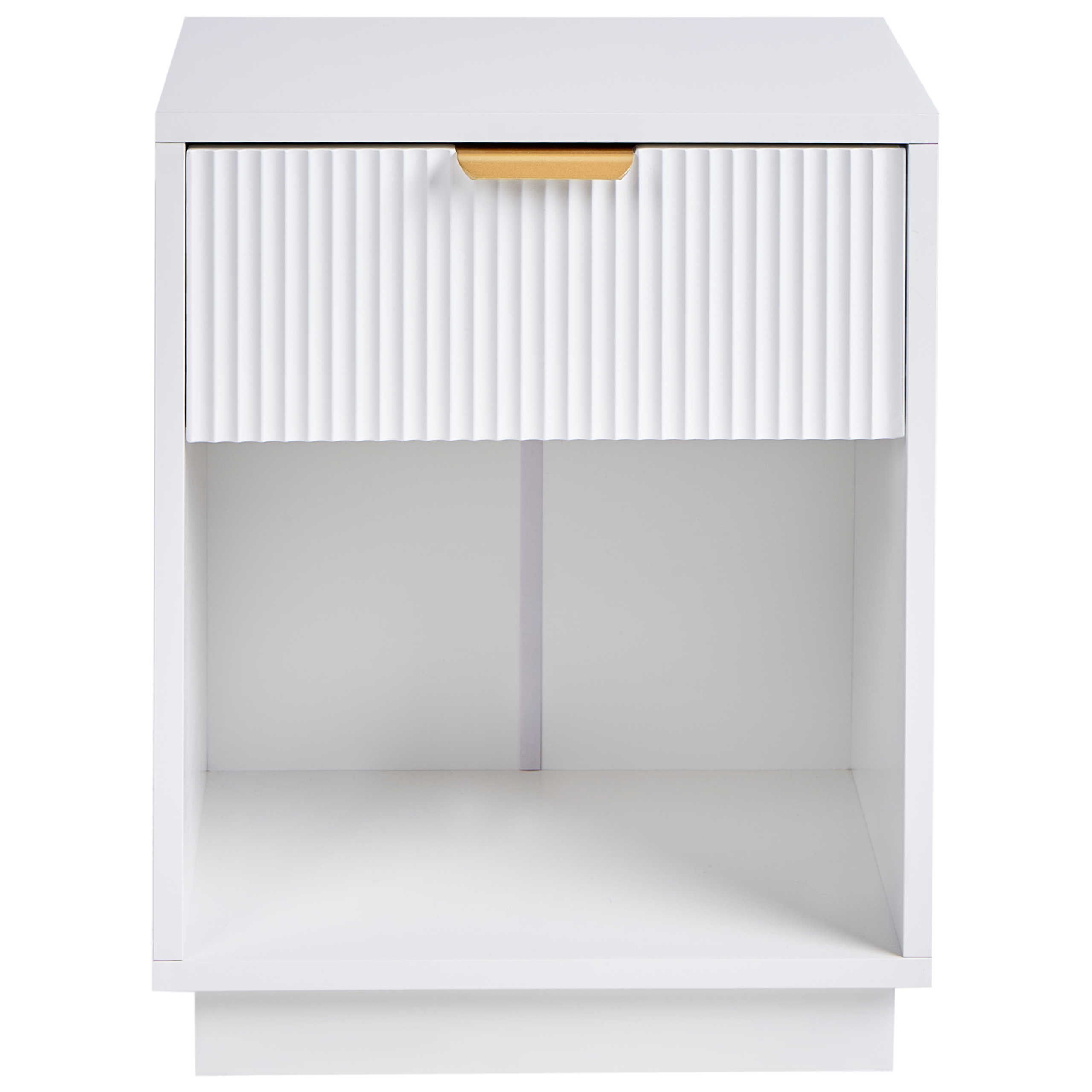 Moderni yöpöytä uurretulla laatikolla. Tämä siisti ja tyylikäs valkoinen yöpöytä tuo eleganssia mihin tahansa makuuhuoneeseen modernilla ilmeellään. Siinä on laatikko, jossa on kauniisti uurrettu etuosa ja kullanvärinen kahva, mikä tuo tilaan ripauksen hienostuneisuutta. Alla oleva hylly tarjoaa ylimääräistä säilytystilaa kirjoille tai koristeille. Yöpöytä on suunniteltu sekä käytännölliseksi että visuaalisesti houkuttelevaksi, ja sen selkeät linjat sekä minimalistinen muotoilu tekevät siitä täydellisen lisän nykyaikaisiin tiloihin.
