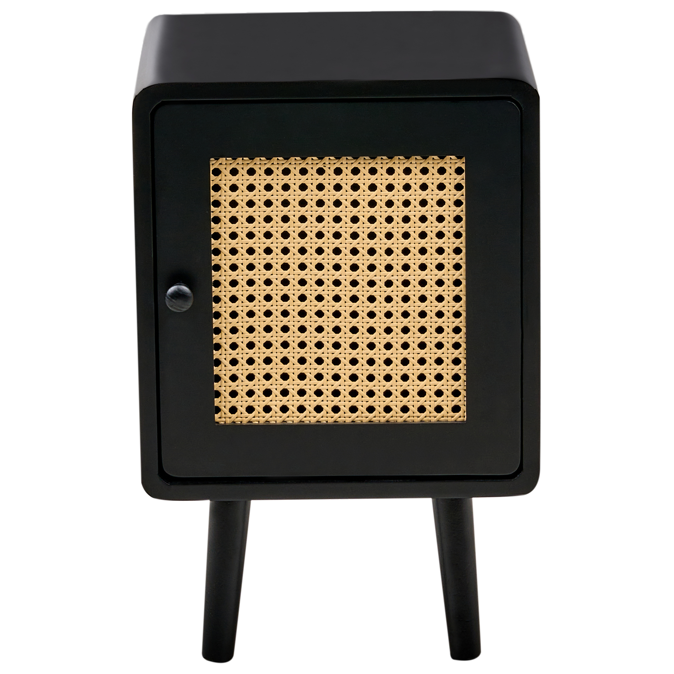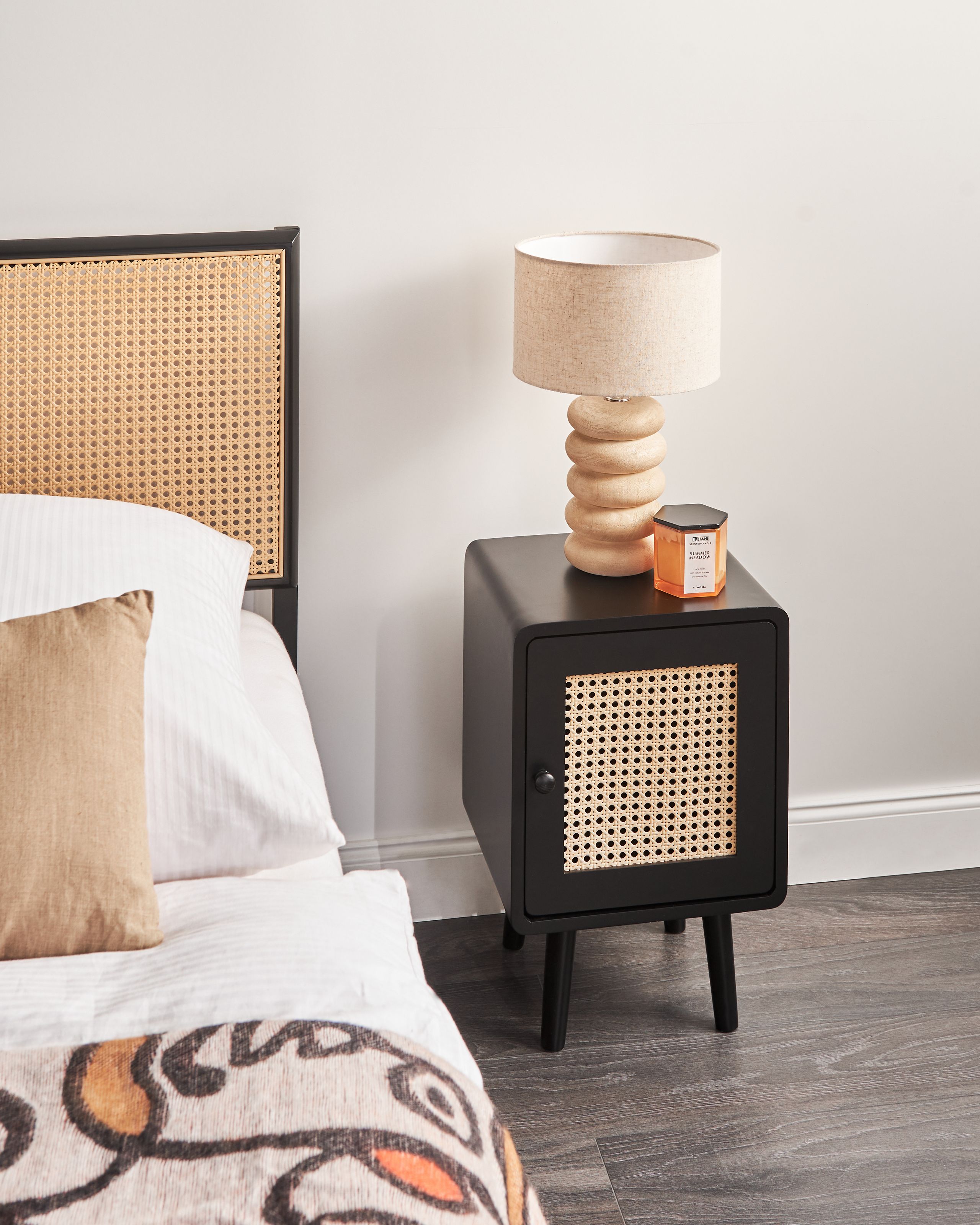 Rustiikkinen sivupöytä polyrottinkiverkolla. Lisää makuuhuoneeseen viehättävää ilmettä ja käytännöllisyyttä tällä modernilla yöpöydällä. Sen tilava kaappi auttaa pitämään kaiken järjestyksessä, ja ovessa oleva muovinen rottinkiverkko tuo hienostuneen vivahteen. Minimalistinen muotoilu ja luonnonpuuviimeistely luovat lämpimän ja kutsuvan tunnelman, joka sulautuu vaivattomasti useisiin sisustustyyleihin.